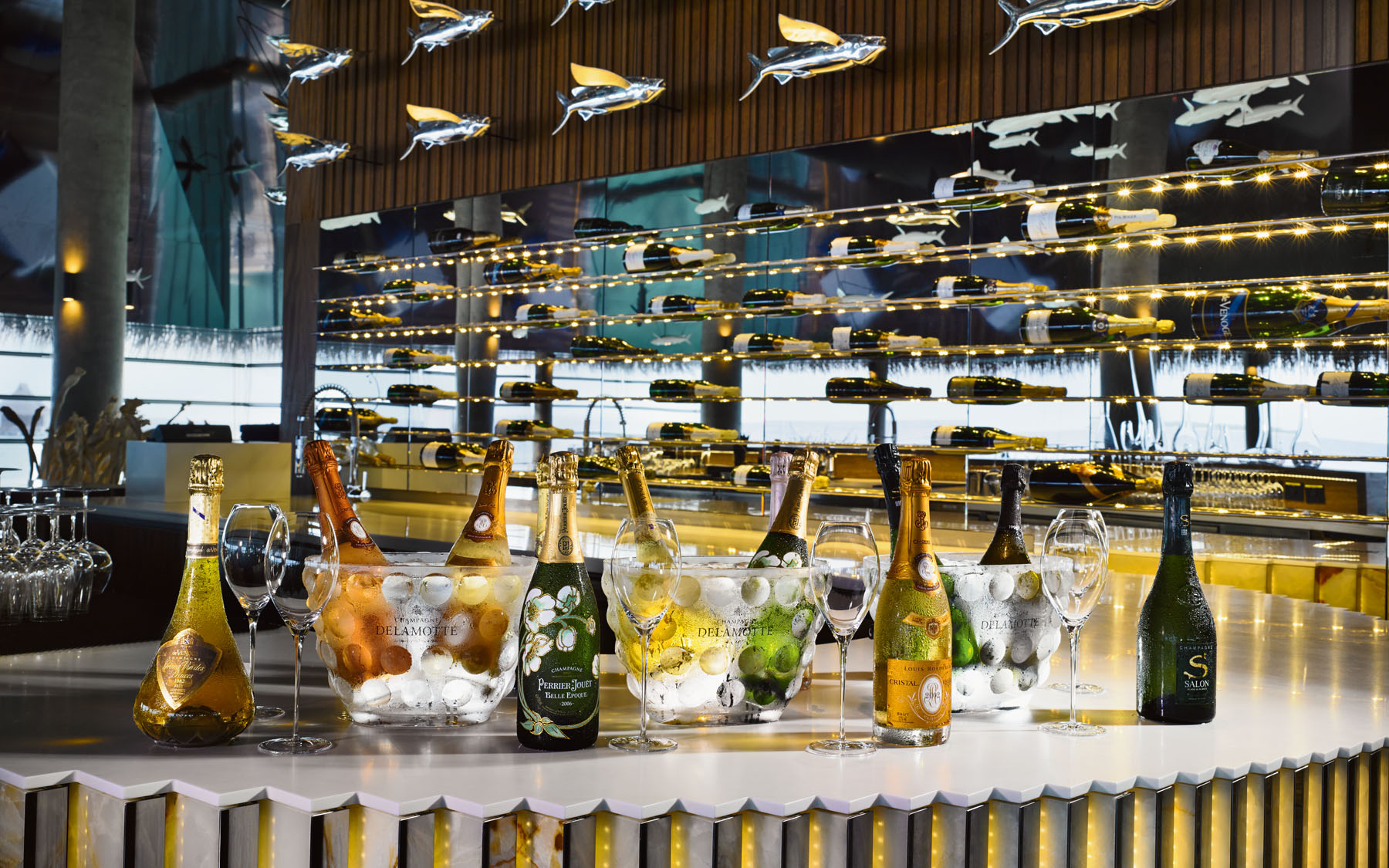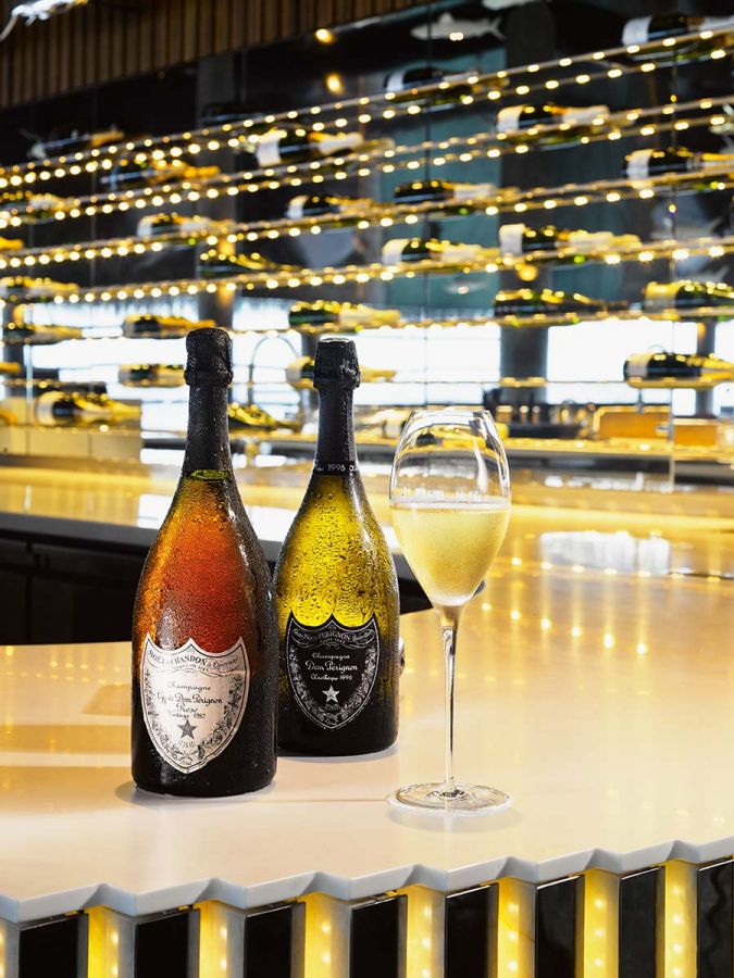 CRU Champagne Lounge 酒廊俯瞰印度洋湛蓝的海水,散发着无与伦比的优雅气息,客人可以在专业侍酒师的指导下品尝世界上最好的和最稀有的香槟。
