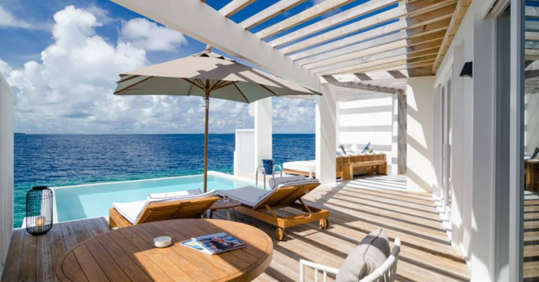 度假村的水屋有直接下海浮潜的阶梯,也能只用站在房间露台的甲板上,都能清楚地看见水下的珊瑚礁,各种鱼类,和从海面一跃而起的海豚。