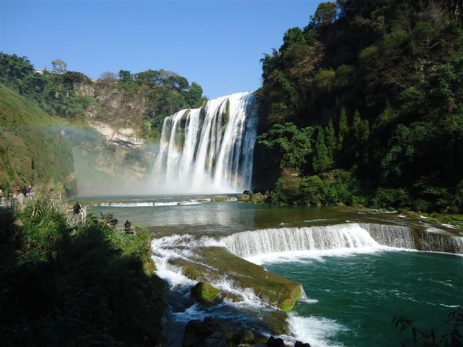 黄果树大瀑布是黄果树瀑布群中最为壮观的瀑布,是世界上唯一可以从上、下、前、后、左、右六个方位观赏的瀑布,也是世界上有水帘洞自然贯通且能从洞内外听、观、摸的瀑布。
