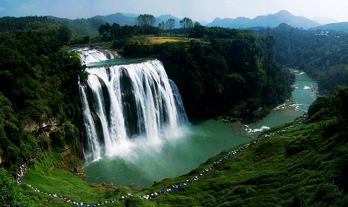 它雄伟壮丽,气势磅礴。在一片青山环抱的峡谷中,在一片苍翠的绿意中,瀑布从天而挂,如银如练,如丝如雪,如肌如肤,如雨似雾,仰望而去,天外之水一般,在荆棘遍地的高山中部撕开一道巨口,从高山顶部倾泄而下,从山顶到山腰,水流撕成几十条绢布一般丝丝缕缕直泄而下,流金泄银落进山下的巨潭之中,溅起层层水雾,水声隆隆,水流犹如蛟龙出洞一般,从潭底涌出,沿着怪石嶙峋的峡谷河床汹涌的冲向远方,巨大的水声深深的震撼着我脆弱的内心,黄果树瀑布名不虚传。