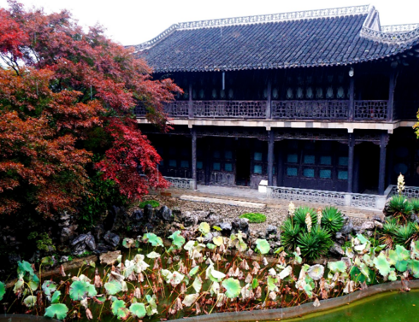 进入何园的东大门,首先看到的是何园的后花园,整个后花园分东、西两部分。穿过“寄啸山庄”的圆洞门,呈现在我们眼前的是牡丹厅,迎面山墙上嵌有“凤吹牡丹”的砖雕,牡丹厅因此而得名。