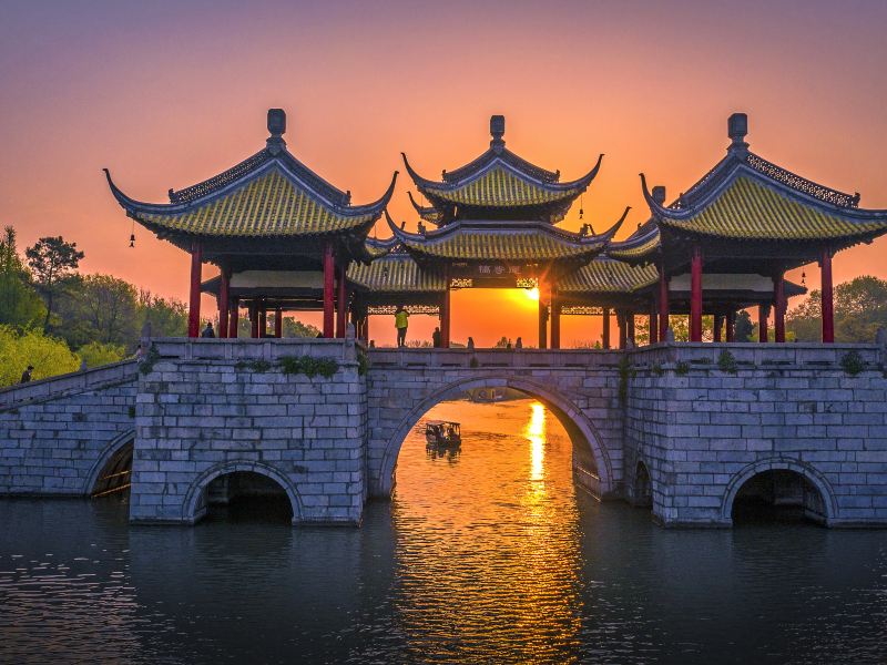 第二天清晨,皇帝开轩一看,只见五亭桥旁一座白塔巍然耸立,以为是从天而降,身旁的太监连忙跪奏道:“是盐商大贾,为弥补圣上游西湖之憾,连夜赶制而成的”。