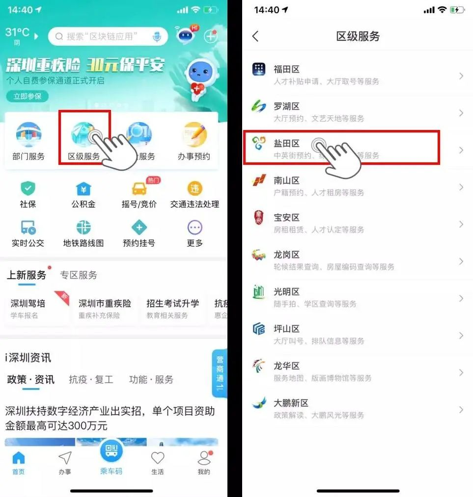 首页进入“区级服务”找到“盐田区”
