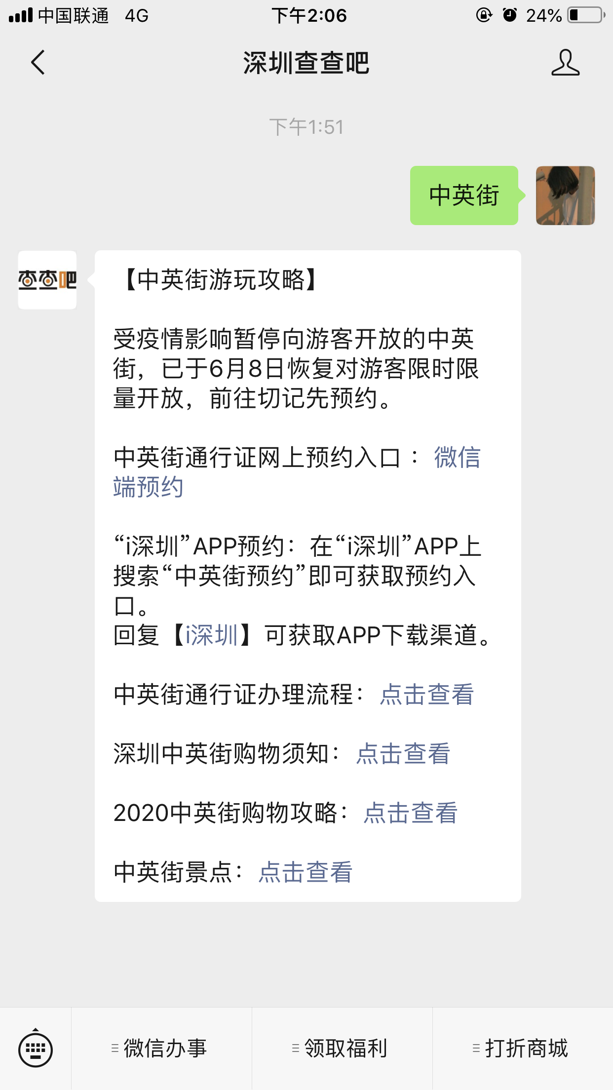 市民可直接在【深圳查查吧】,微信公众号对话框回复“中英街”获取预约入口。