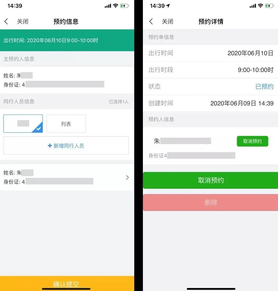 填写主预约人,及随行人员身份信息,完成后点击确认提交即可