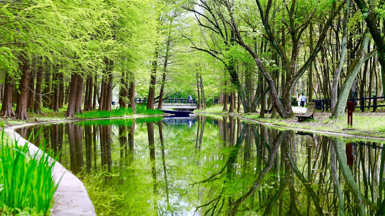上海共青森林公园是以森林为主要景观的特色公园,位于上海市东北部杨浦区军工路2000号。其总占地面积为1965亩,分为南北两园,北园占地1631亩,称为共青森林公园;南园占地239.6亩,称为万竹园。南北园风格各异,北园着重森林景色,有丘陵湖泊草地;南园则小桥流水,一派南国风光。