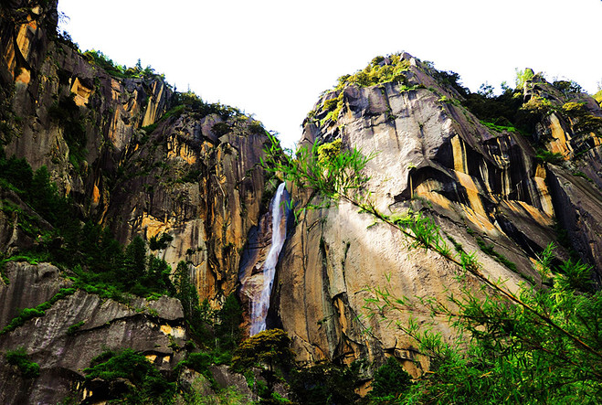 岩峡谷地貌,峡谷两侧都是陡峭的崖壁,在200米高的崖壁上有一条瀑布从天而降,而在瀑布流下的地方有一块形似佛像的石头,水流较大时,佛像在瀑布中若隐若现,因此,这里又叫天佛瀑布景区。