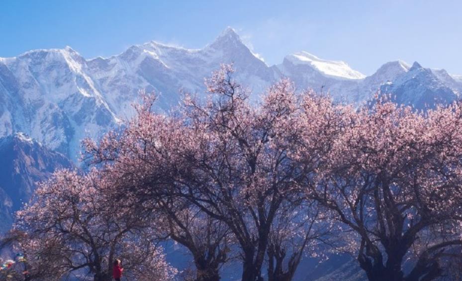 林芝地区的桃花异于江南碧桃的风格,学名叫"光核桃",又名"西藏桃",俗称"野桃",树高花繁,开得狂野。光核桃树体高大,寿命可达千余年。林芝地区的桃花是高原桃花,很多地方山脚桃花盛开,山上则是雪峰,独有风味。