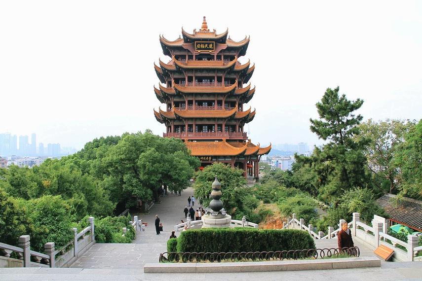 黄鹤楼在湖北省武汉市武昌长江南岸,相传也始建于三国,唐时名声始盛,这主要得之于诗人崔颢"昔人已乘黄鹤去,此地空余黄鹤楼"诗句。黄鹤楼建在城台上,台下绿树成荫,远望烟波浩渺。中央主楼两层,平面方形,下层左右伸出,前后出廊屋与配楼相通。全体屋顶错落,翼角嶙峋,气势雄壮。宋之后,黄鹤楼曾屡毁屡建,清同治七年(1868)重建,但只存在了十几年。现仅留当时楼貌照片,已不是宋画在高台上丛建多座建筑,而取集中式平面,高踞在城垣之上,平面为折角十字,外观高三层,内部实为九层。下、中二檐有12个高高翘起的屋角,总高32米。