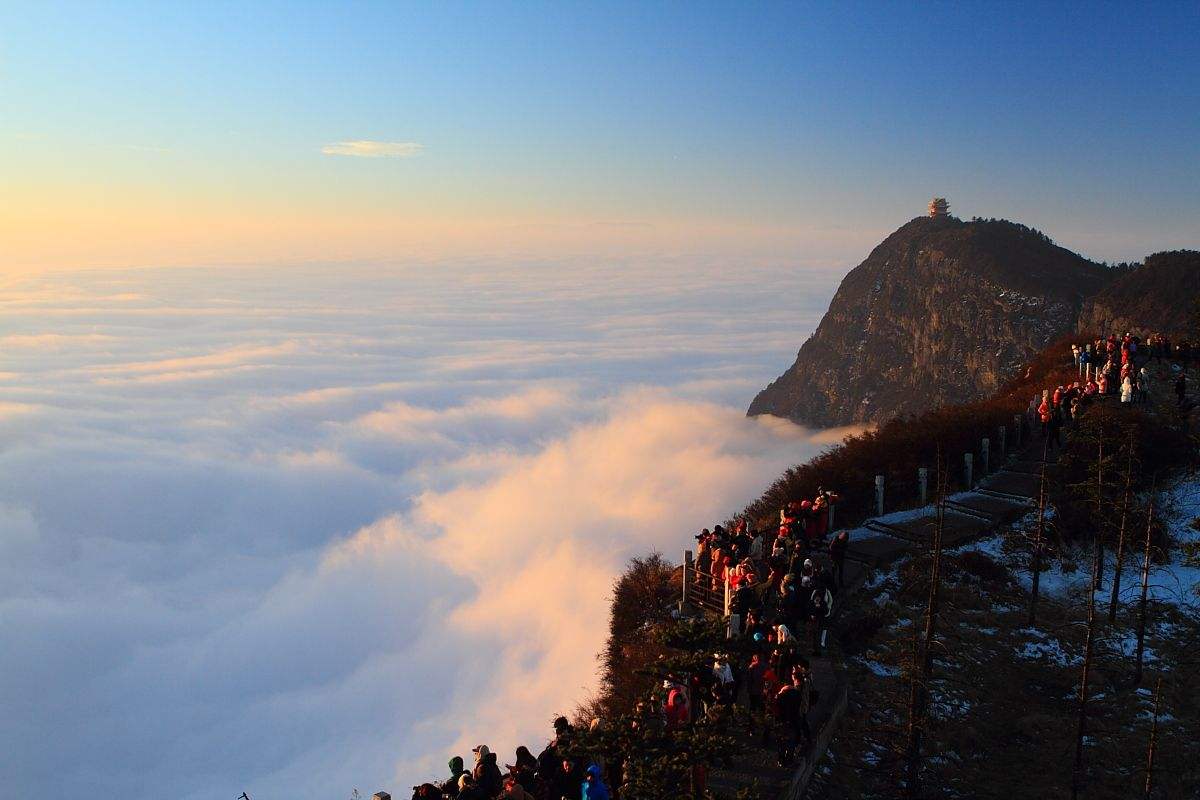 峨眉山(Mount Emei)位于北纬30°附近,四川省西南部,四川盆地的西南边缘,是中国“四大佛教名山”之一,地势陡峭,风景秀丽,素有“峨眉天下秀”之称,山上的万佛顶最高,海拔3099米,高出峨眉平原2700多米。《峨眉郡志》云:“云鬘凝翠,鬒黛遥妆,真如螓首蛾眉,细而长,美而艳也,故名峨眉山。