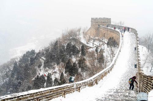 2.八达岭长城雪景。八达岭水关长城位于北京市西北40公里,此段长城是八达岭长城东段,是明长城的遗址,由抗倭名将戚继光督建,距今有四百余年历史。