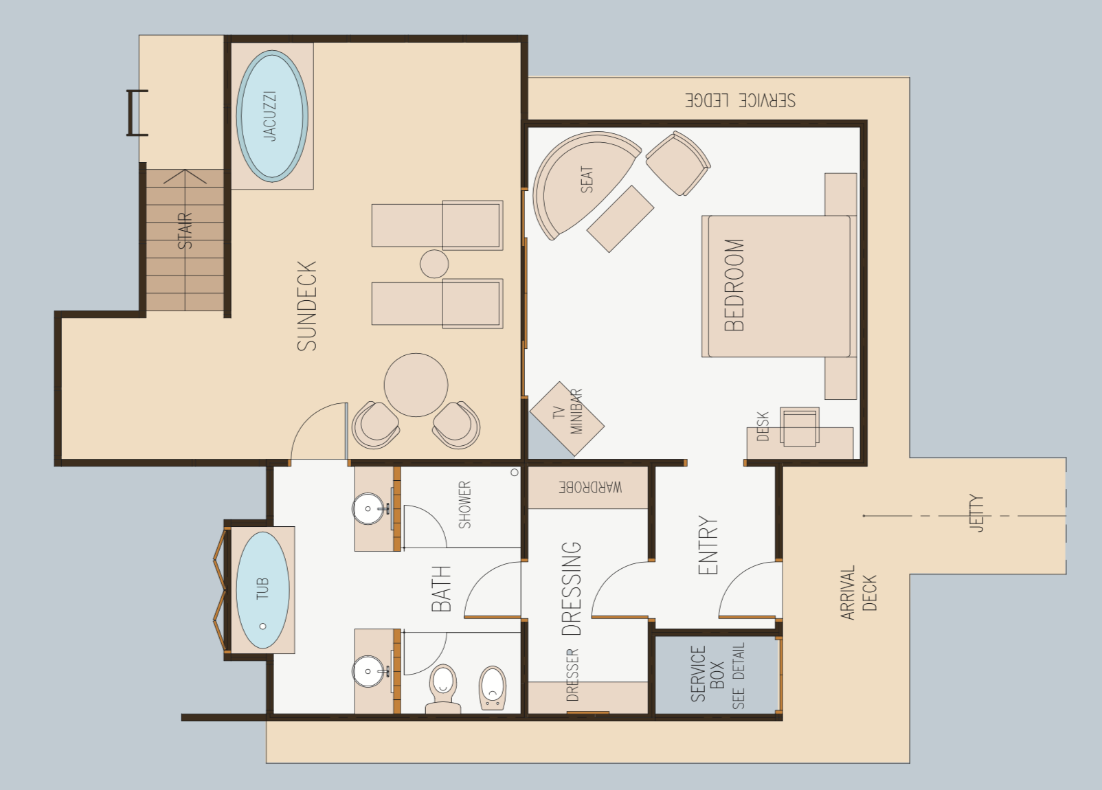 按摩浴缸水上别墅坐落在泻湖碧绿的海水上,是豪华和隐私的中心。别墅的内部装饰有豪华的家具和私人阳光甲板上的按摩浴缸。豪华浴室配有双梳妆台,花洒淋浴和滚顶浴缸,享有泻湖一览无余的美景。