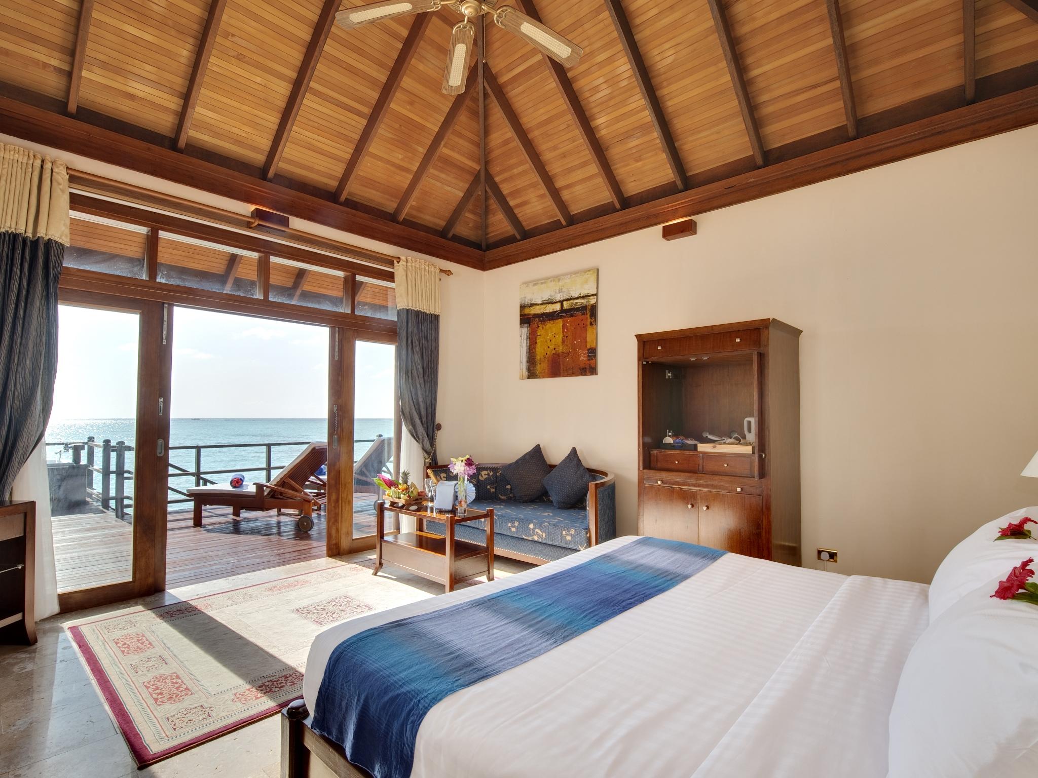 尊贵按摩浴缸水上别墅拥有独特的舒适环境,在宽敞的私人日光浴平台上享受私人按摩浴缸。房间提供豪华的独立起居室,配有舒适的沙发床,可在室内享受宁静的氛围。非常适合情侣在马尔代夫度蜜月或浪漫之旅。