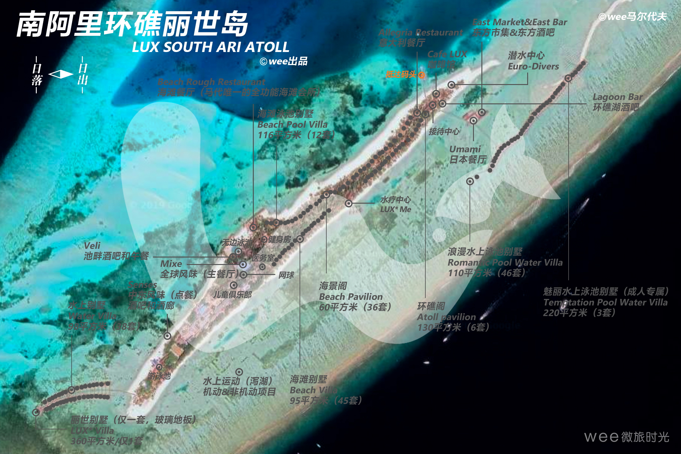 南阿里环礁丽世岛(LUX South Ari Atoll)2008年开业,属于LUX酒店品牌,环岛周长3090米,在马尔代夫属于巨型度假岛屿,距离马累机场104公里。