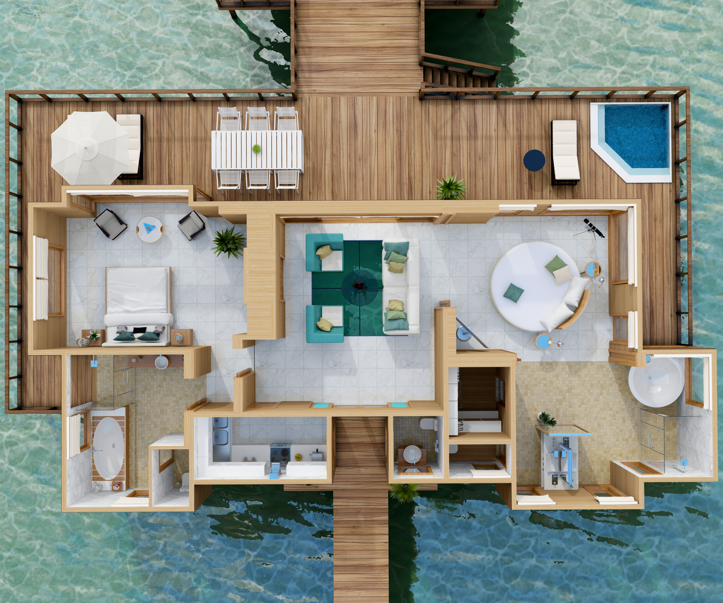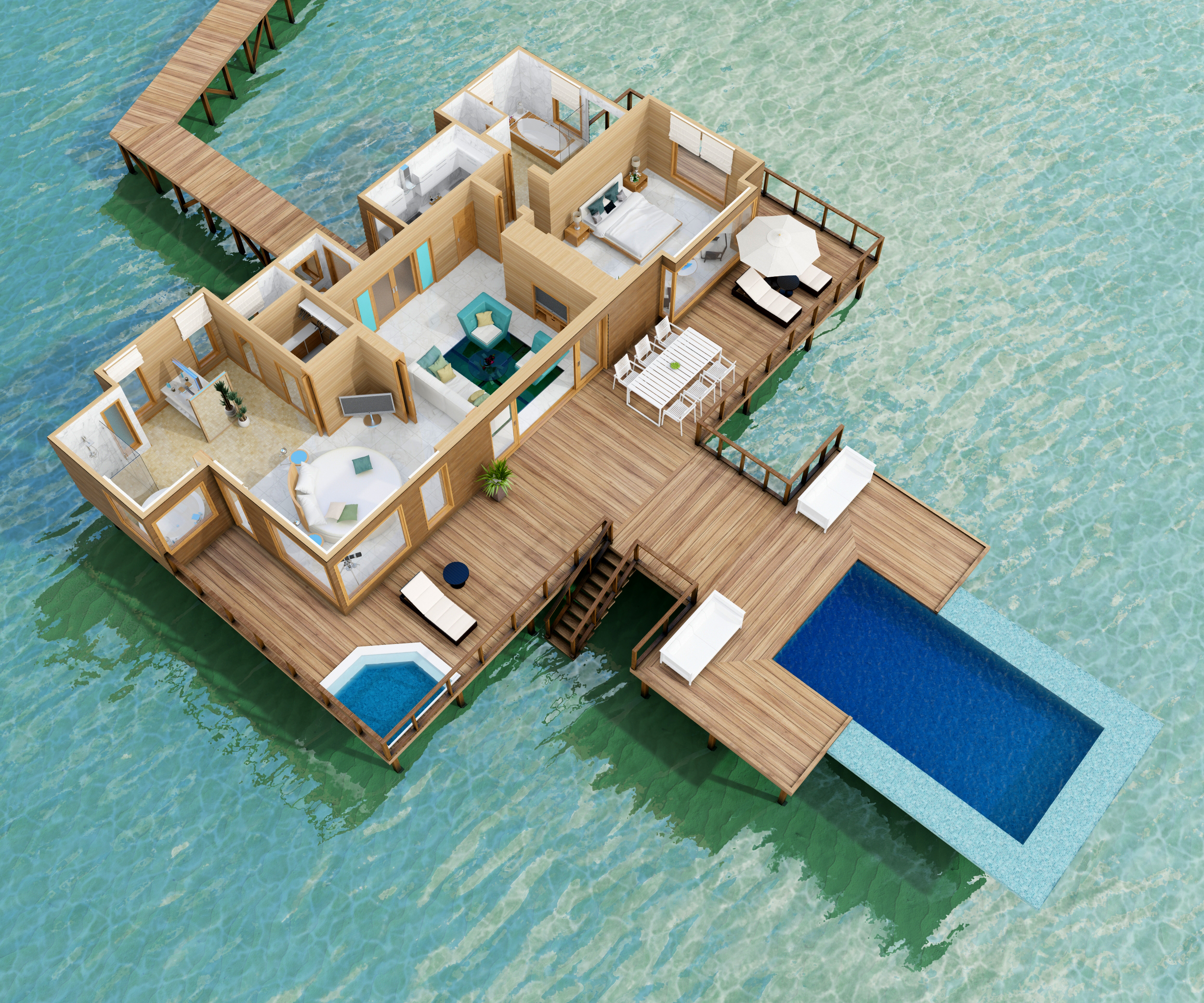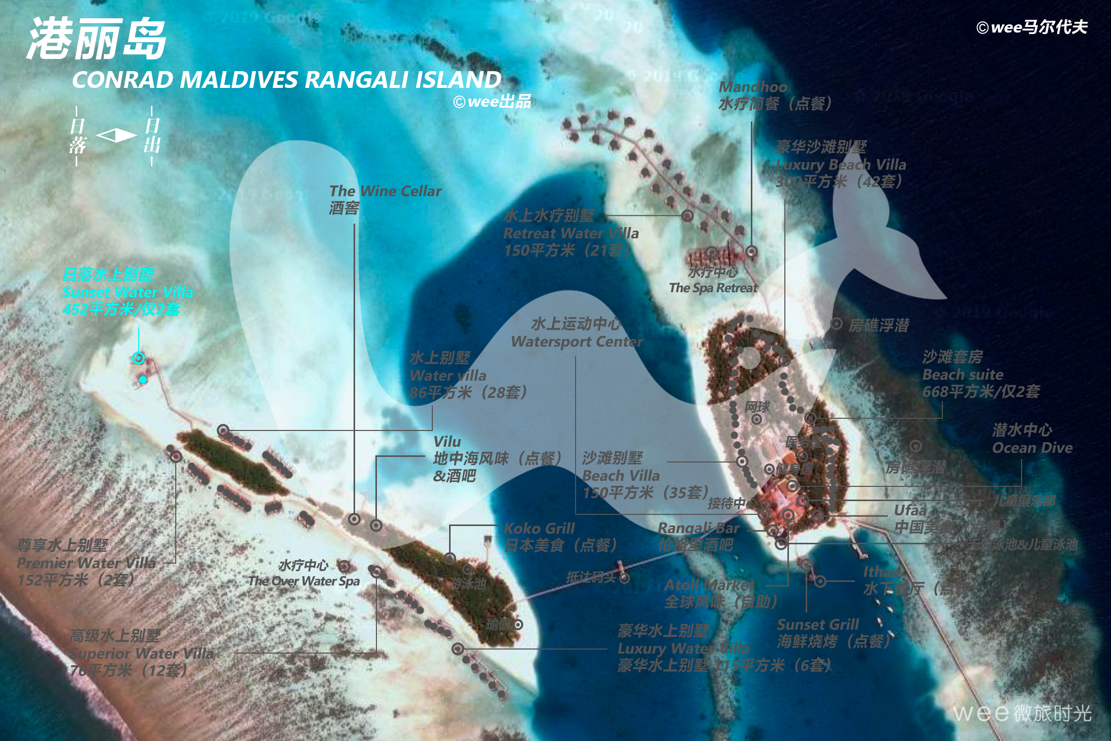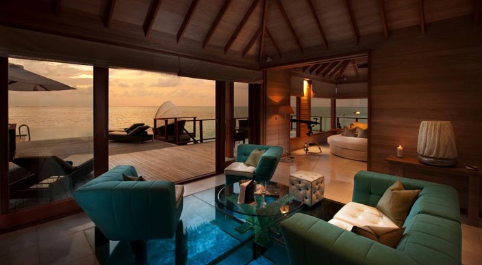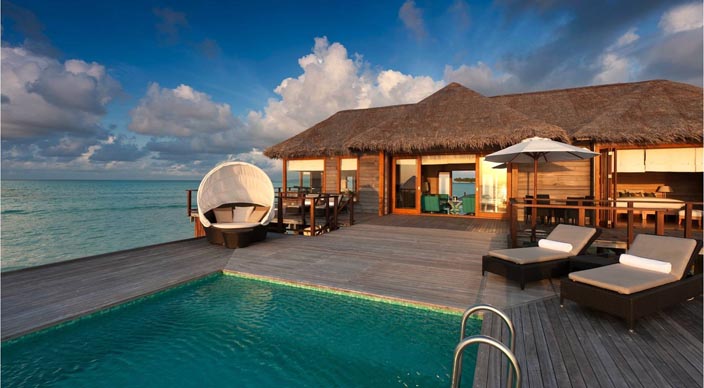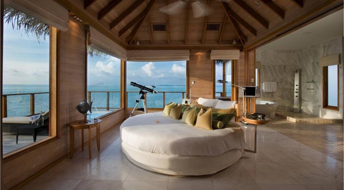 日落水上别墅处于泻湖一个僻静的地方。这些双方型的别墅是奢华的象征,454平米的生活空间与一系列的豪华设施,包含私人管家、玻璃地板客厅与一个在大海里的私人游泳池。日落水上别墅曾是皇室成员、名人显要和世界顶级运动明星下榻的地方。日落水上别墅最大的特色是在主卧室有个可旋转圆形床,会随着太阳的运动旋转180°。