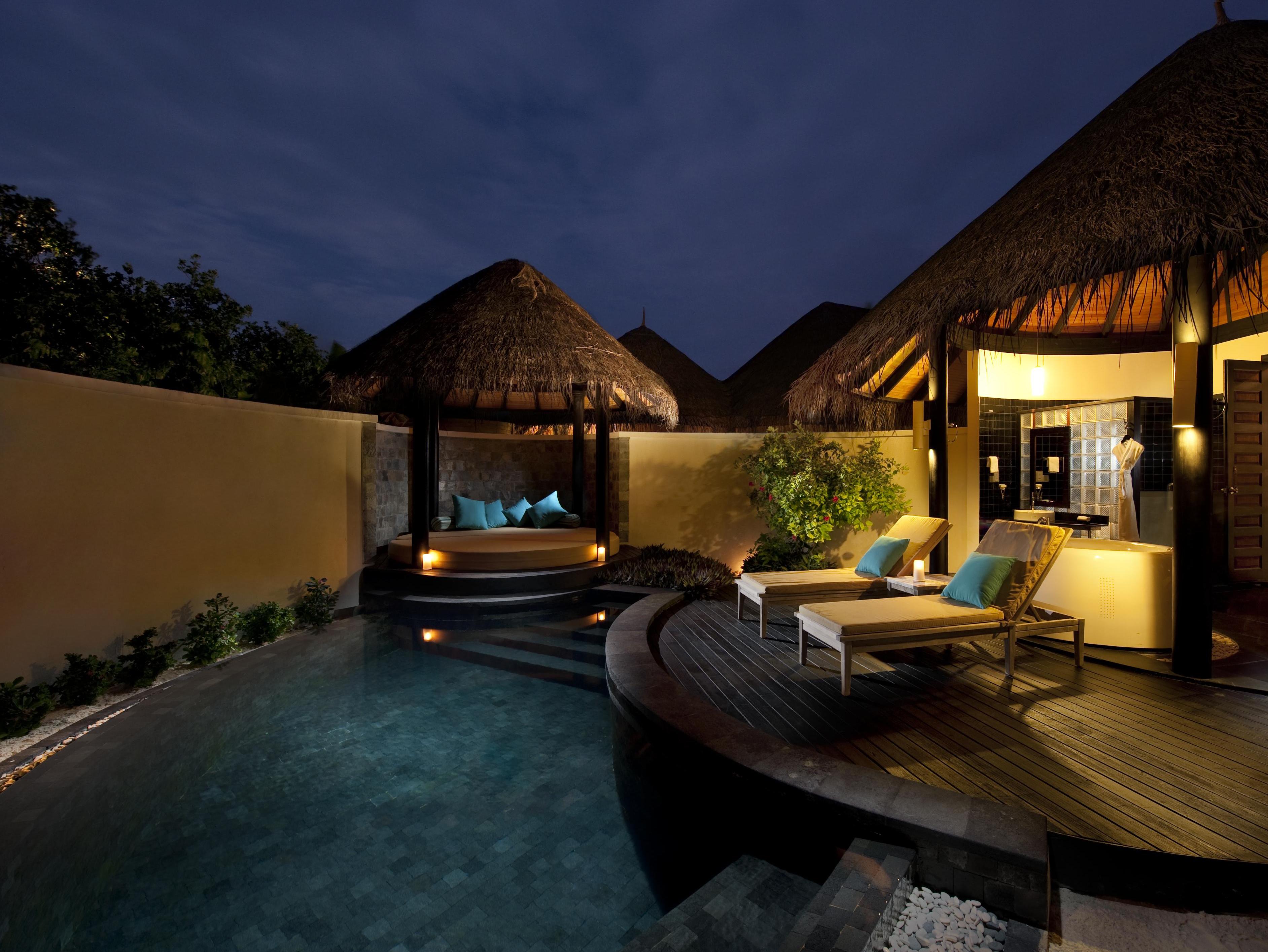 在水上套房可纵情享受带有一个主卧室和独立起居区的宽敞住宿空间。打开卧室的推拉门,客厅和浴室通往多层阳台,设有带熔岩石游泳池,小屋和户外用餐区的私人户外甲板。