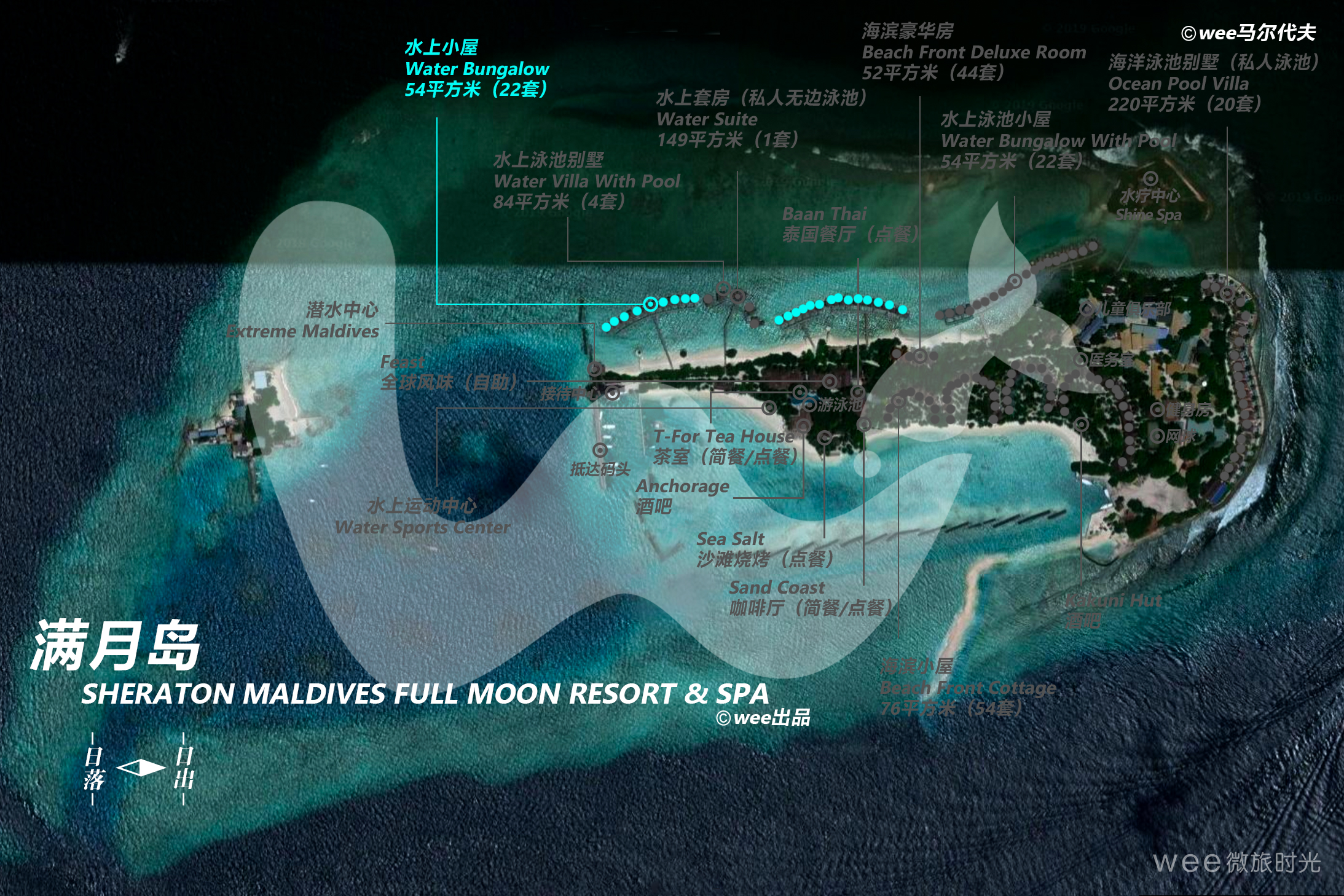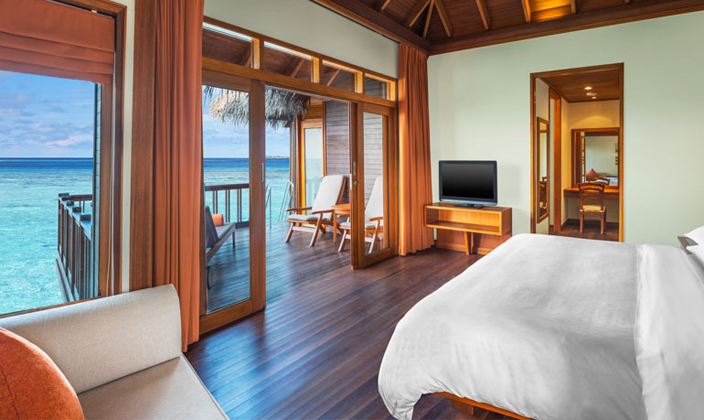 分散于度假村北侧的海面上的水上小屋供应私密浪漫的宜人氛围,并有着饱览波澜壮阔的迷人海景。屋里各种设施非常齐全,还有大床、睡椅等家具,给年轻情侣营造出浪漫气氛。在私人阳台露台上能够尽享和煦的阳光,感受清新的空气,欣赏一望无际的海景,还可以直接通往清澈见底的礁湖。