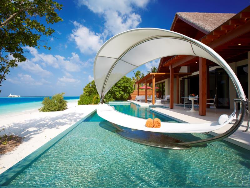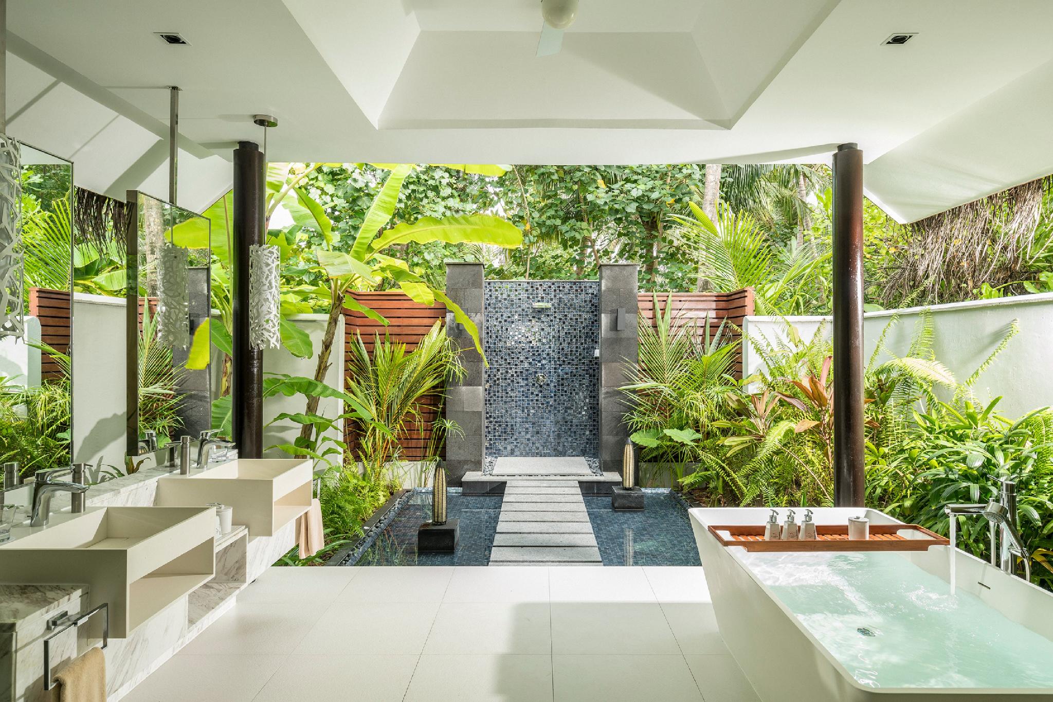 走入室内,清新的纯白基调中不时闪耀一抹抹艳丽的红色。高科技玩具和美味小吃打造出一处室内游乐场,还有你的私人雨淋花洒。如果需要什么,只需呼叫私人管家Thakuru。