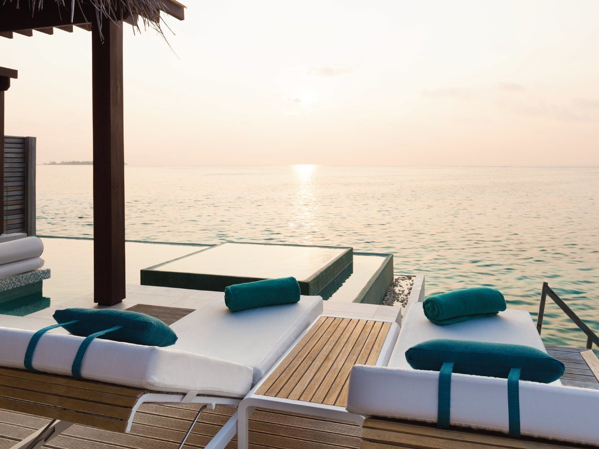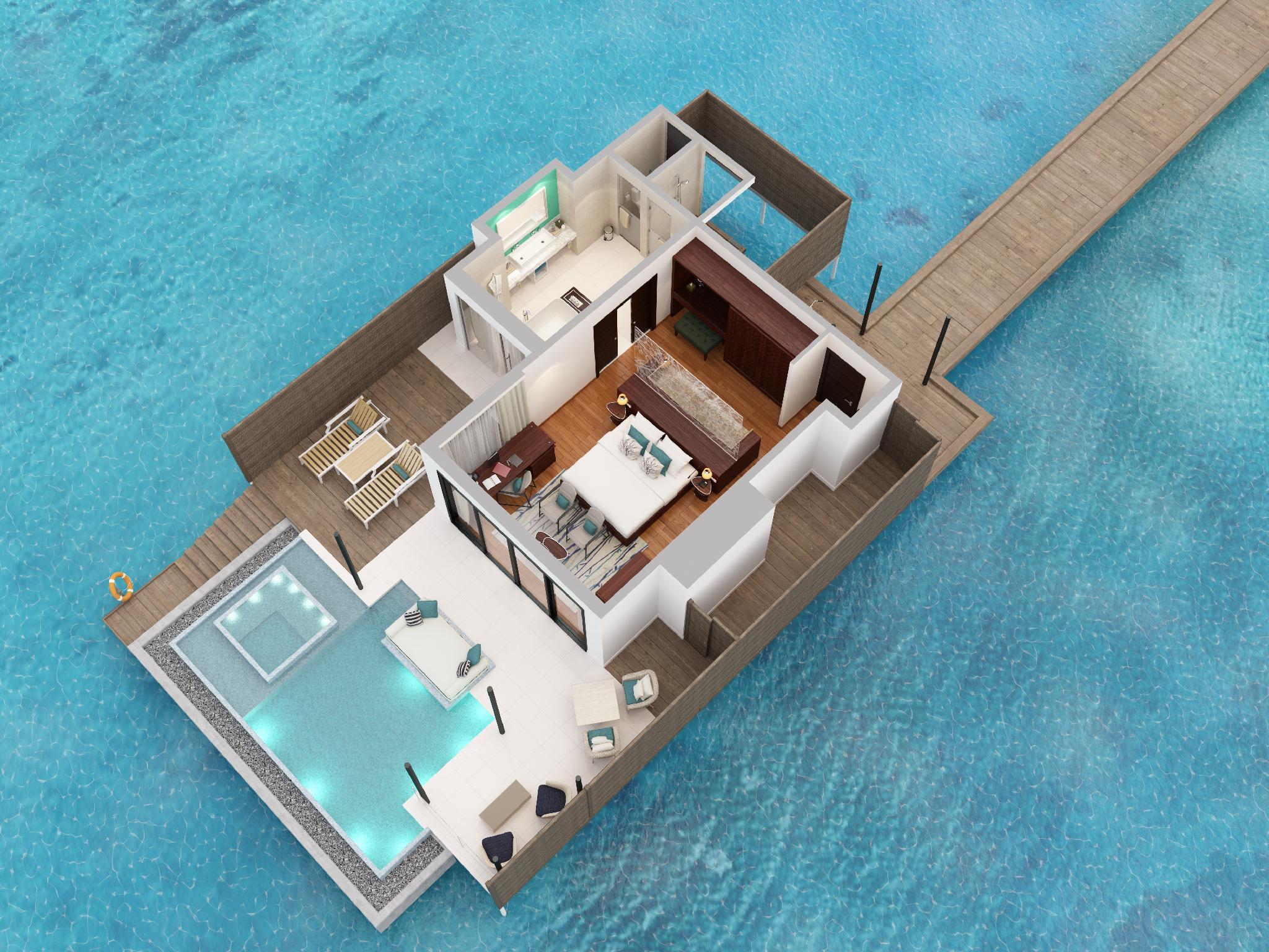 海景水上静居,拥有充裕的玩乐空间。醒来就看到洒满阳光的环礁湖,跳进去感受水温的清凉。走入室内,时尚的豪华设施,在平台上休憩。白天在私人泳池里畅游,晚上在按摩池里欣赏满天繁星。