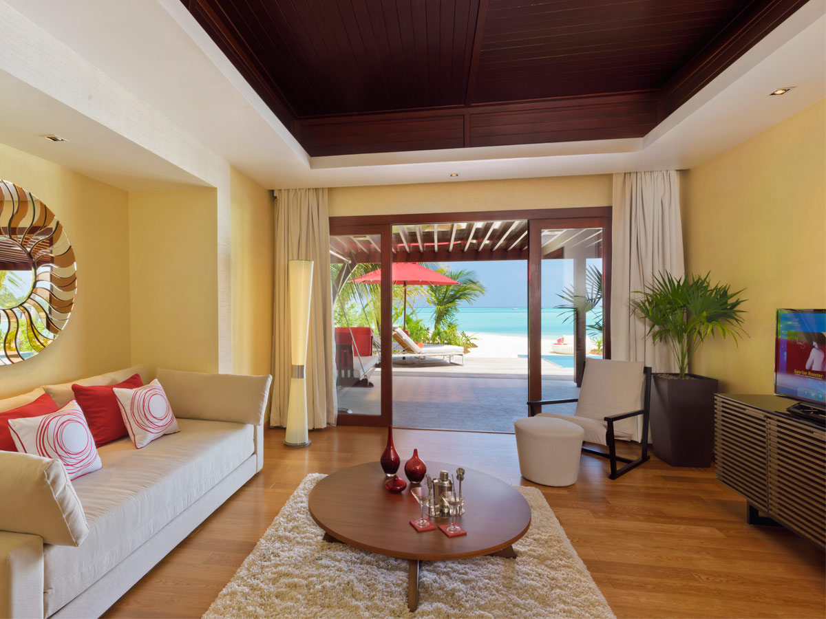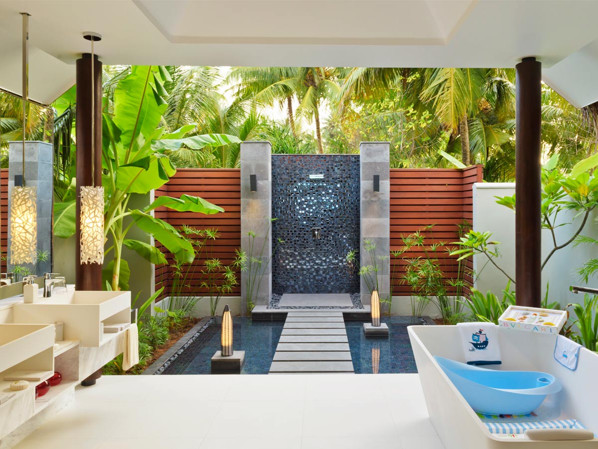 海滩套房是休憩和玩耍的私密天地,起居室在晚上就变成了两个人的超大舒适空间。浸在舒适的浴缸里,享受露天沐浴,选择室内和室外雨淋花洒,在葱郁的棕榈树环绕中放松身心。来一点爆米花和鸡尾酒,在柔缓的音乐中感受清风拂面。