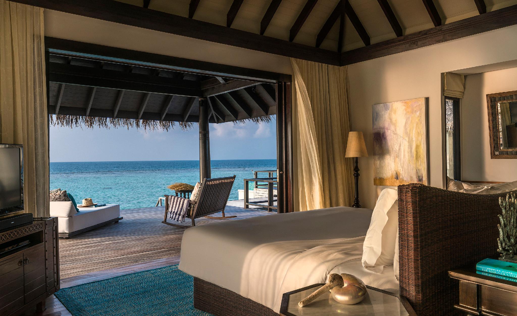 Sunset Over Water Pool Villa 日落水上泳池别墅,用条纹木材搭成而建在水上,并配有挑高的天花板和硬木地板,让人感觉仿佛置身于大海之中。在私人游泳池欣赏令人眼花缭乱、不断变化的天空和马尔代夫夕阳。浴室设有凹陷的玻璃底浴缸,沐浴于波光粼粼之上。甲板还有一个超大的无边泳池。入夜,在轻轻浪花声中悄然入睡。