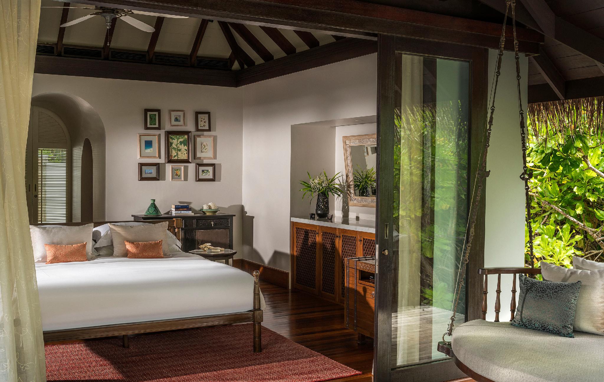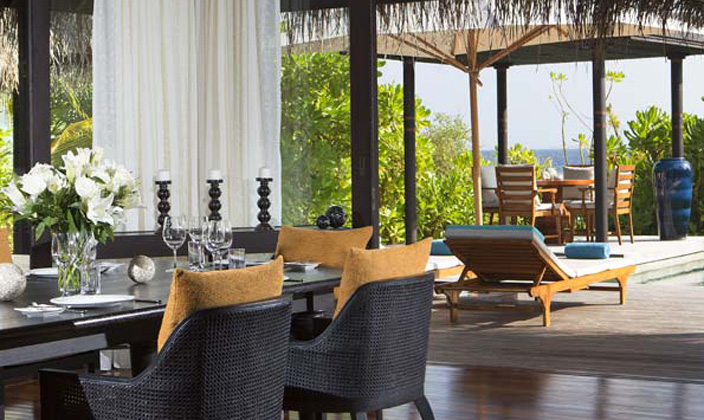 Two Bedroom Water Villa with Pool 水上双卧室别墅,以宁静的蓝色和绿色为基调,采用抛光木质室内装潢,拥有户外沙发床、宽敞明亮的起居室。傍晚时分,在水上用餐区享用私人日落晚餐——脚下黑影一闪,姿态优雅的魔鬼鱼从玻璃地板下游过,这种感受无法用言语形容。