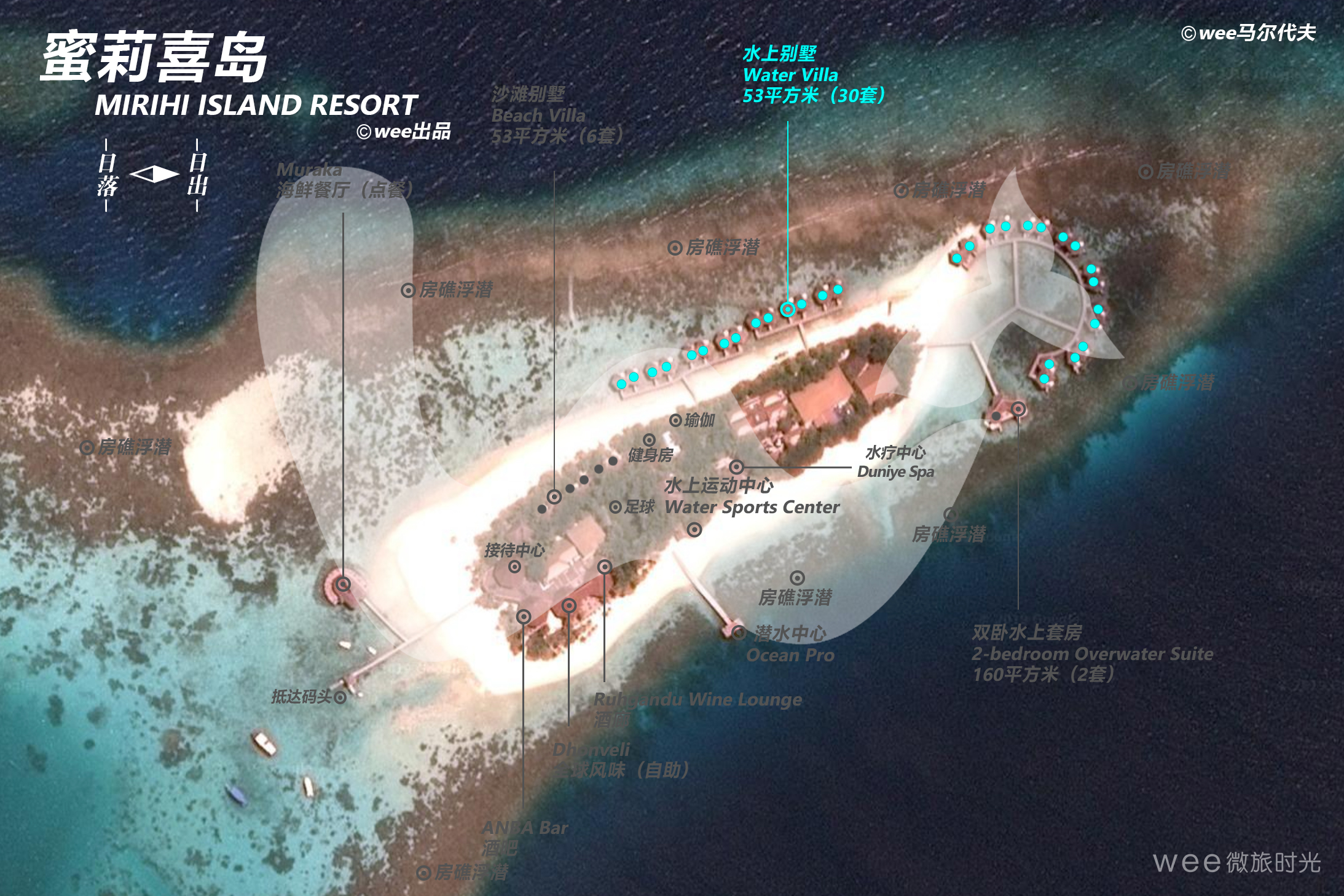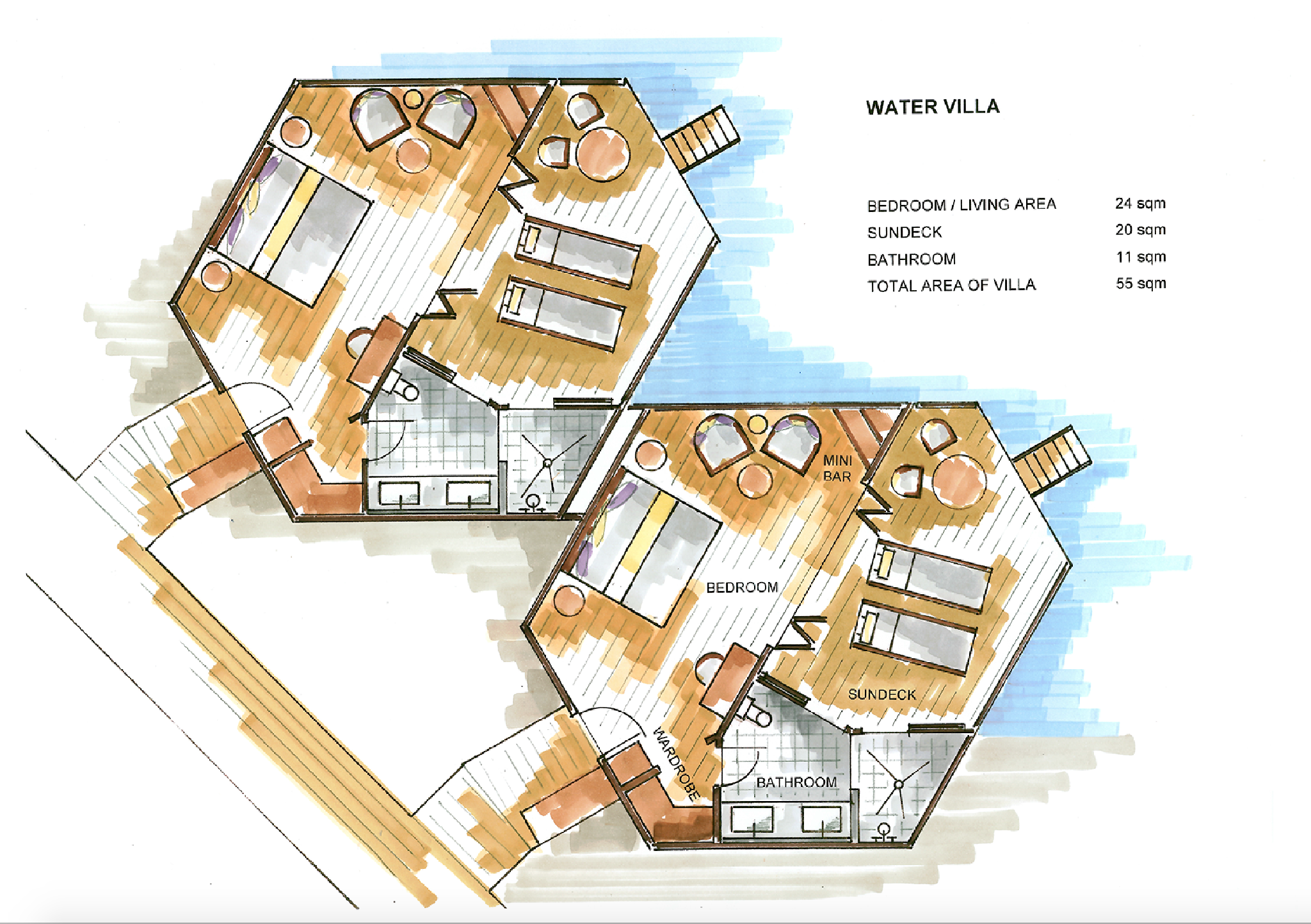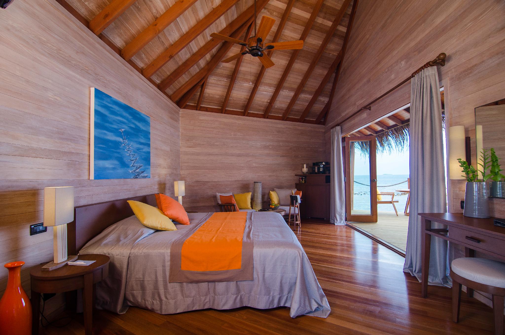 豪华舒适的水上别墅,竖立在蓝色礁湖上。家具设计独特,宽敞的水上别墅,奢华的浴室,透过落地玻璃拉门即可看见整个海景。室外私人的甲板,每个阳台的设计都能确保完全的私密性。每间水上别墅都可以直接从甲板直接下海。