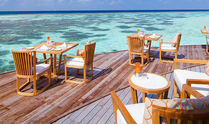 Muraka 餐厅的位置刚好是夕阳落下的方向,视线所及除了海还是海,整个餐厅采用圆弧型设计,所有的位置都可以看到落日。餐盘内美味的海鲜,龙虾,安格斯牛排,配上各国红酒。品位美酒的同时,在甲板上共进浪漫的晚餐,欣赏着壮丽的落日。