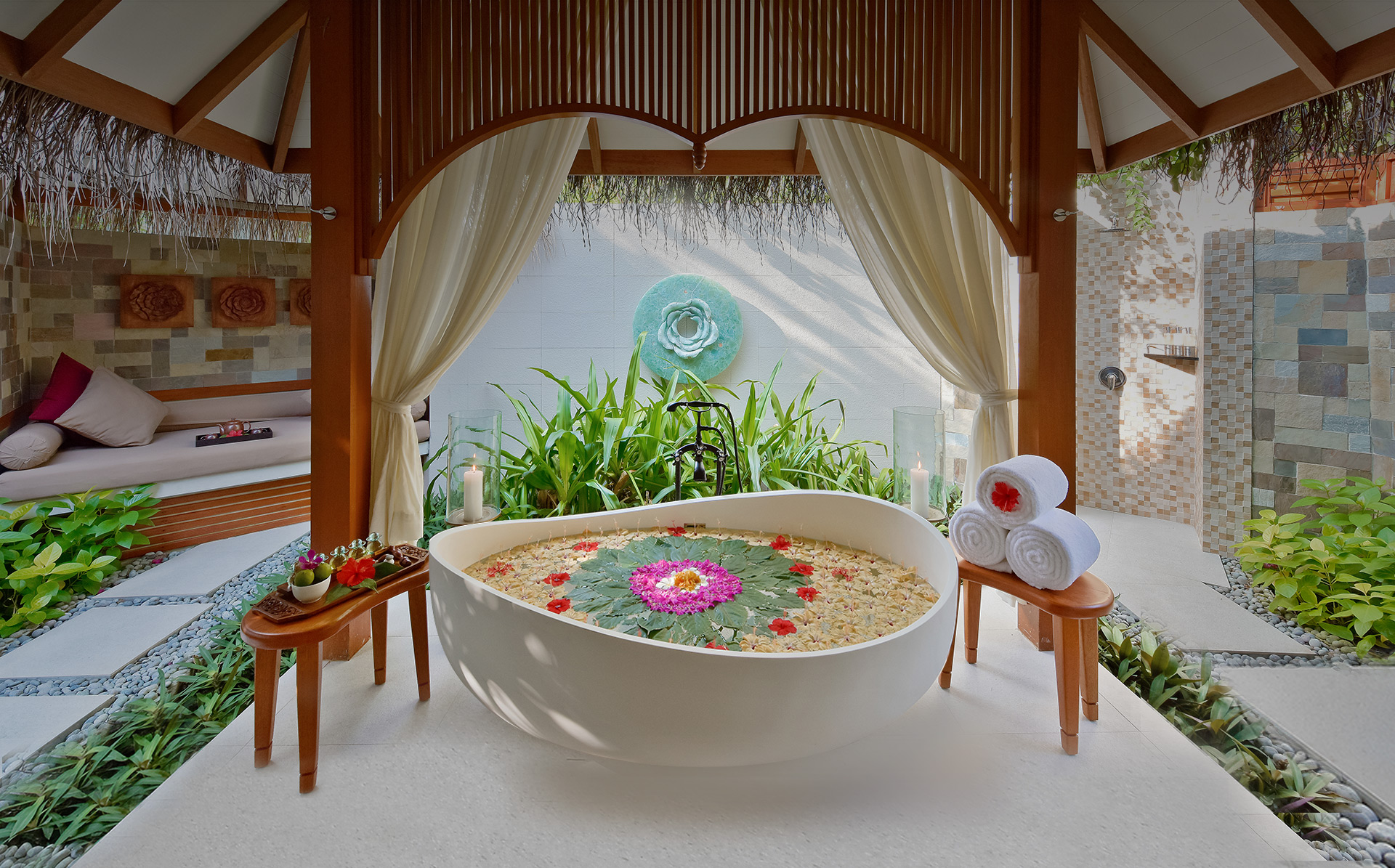 ・每间私人套房外设有休闲区 - 花洒淋浴,热带花园中的浴缸