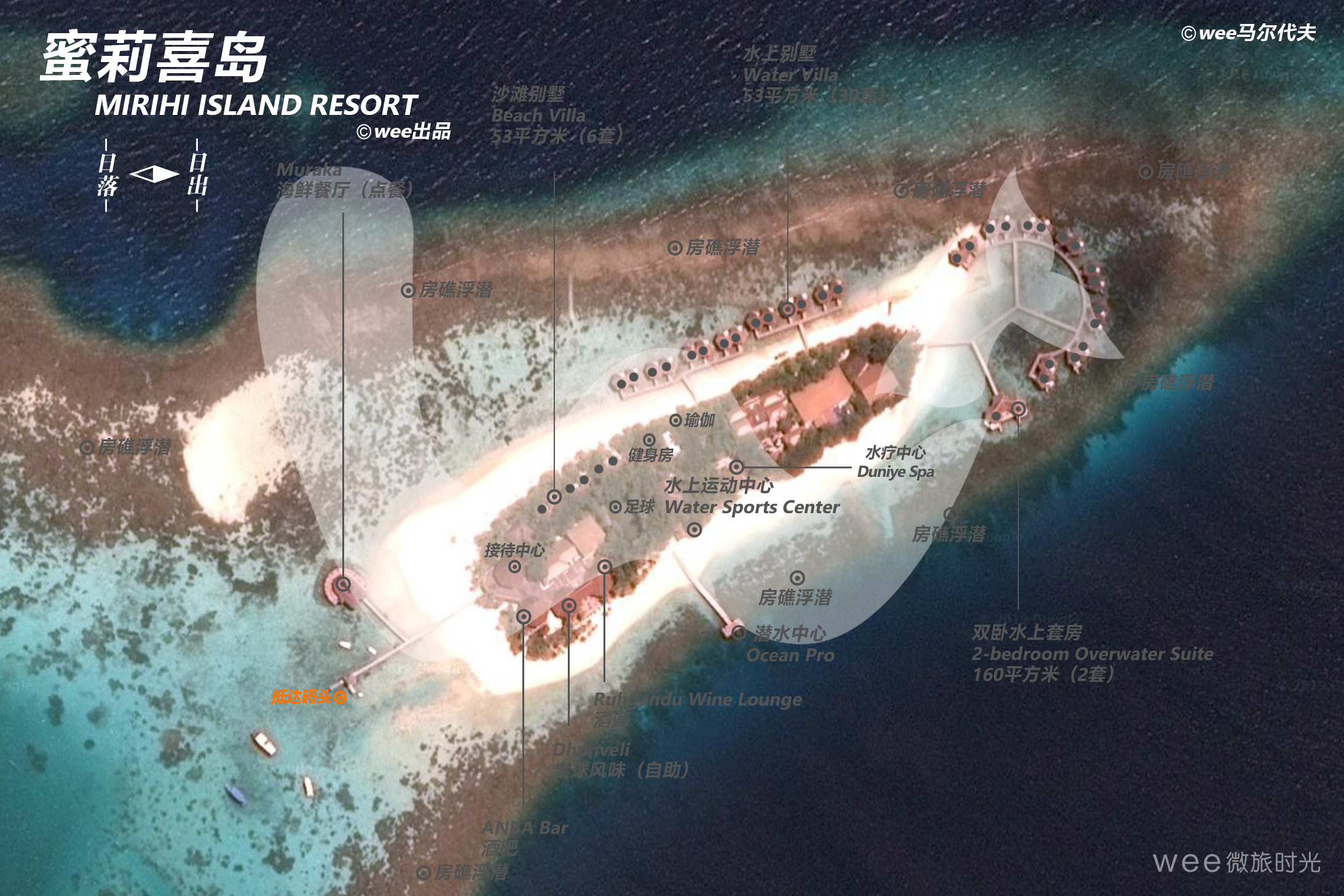 蜜莉喜岛位于阿里环礁,距离马累机场90公里,,环岛周长750米,在马尔代夫属于小型度假岛屿。沙滩5分/最高5分,100%环岛,平均宽度20米;浮浅5分/最高5分,房礁80%环岛,距离沙滩最近10米。