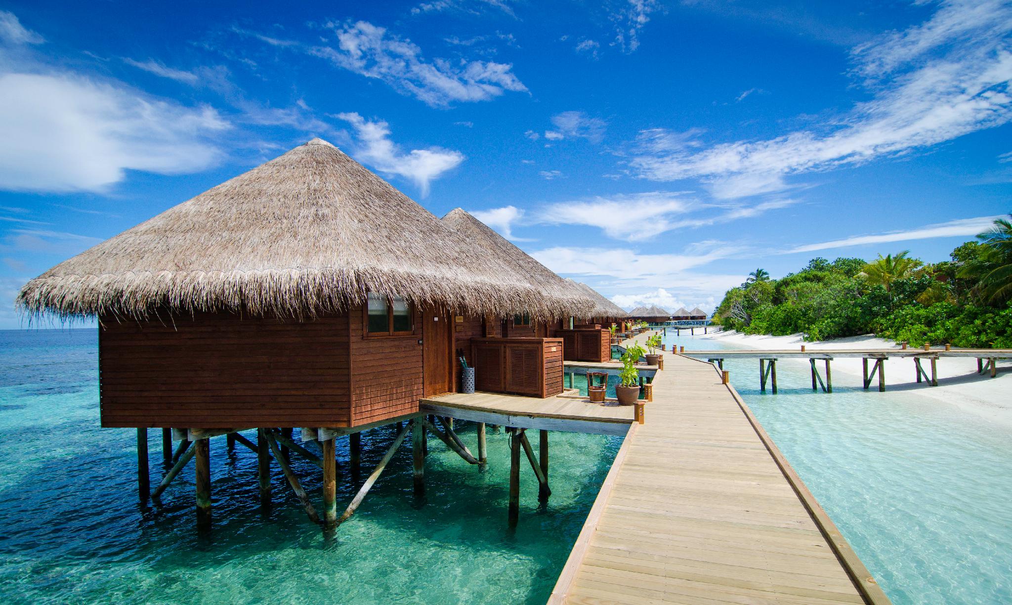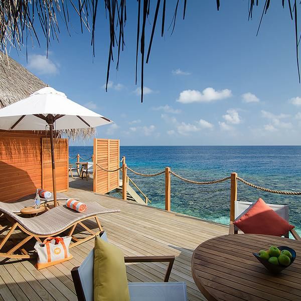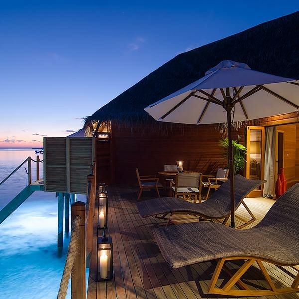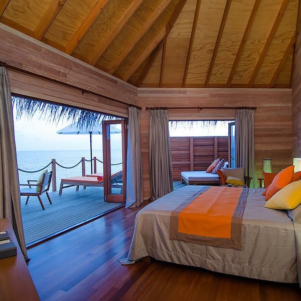 豪华舒适的水上别墅,竖立在蓝色礁湖上。家具设计独特,宽敞的水上别墅,奢华的浴室,透过落地玻璃拉门即可看见整个海景。室外私人的甲板,每个阳台的设计都能确保完全的私密性。每间水上别墅都可以直接从甲板直接下海。