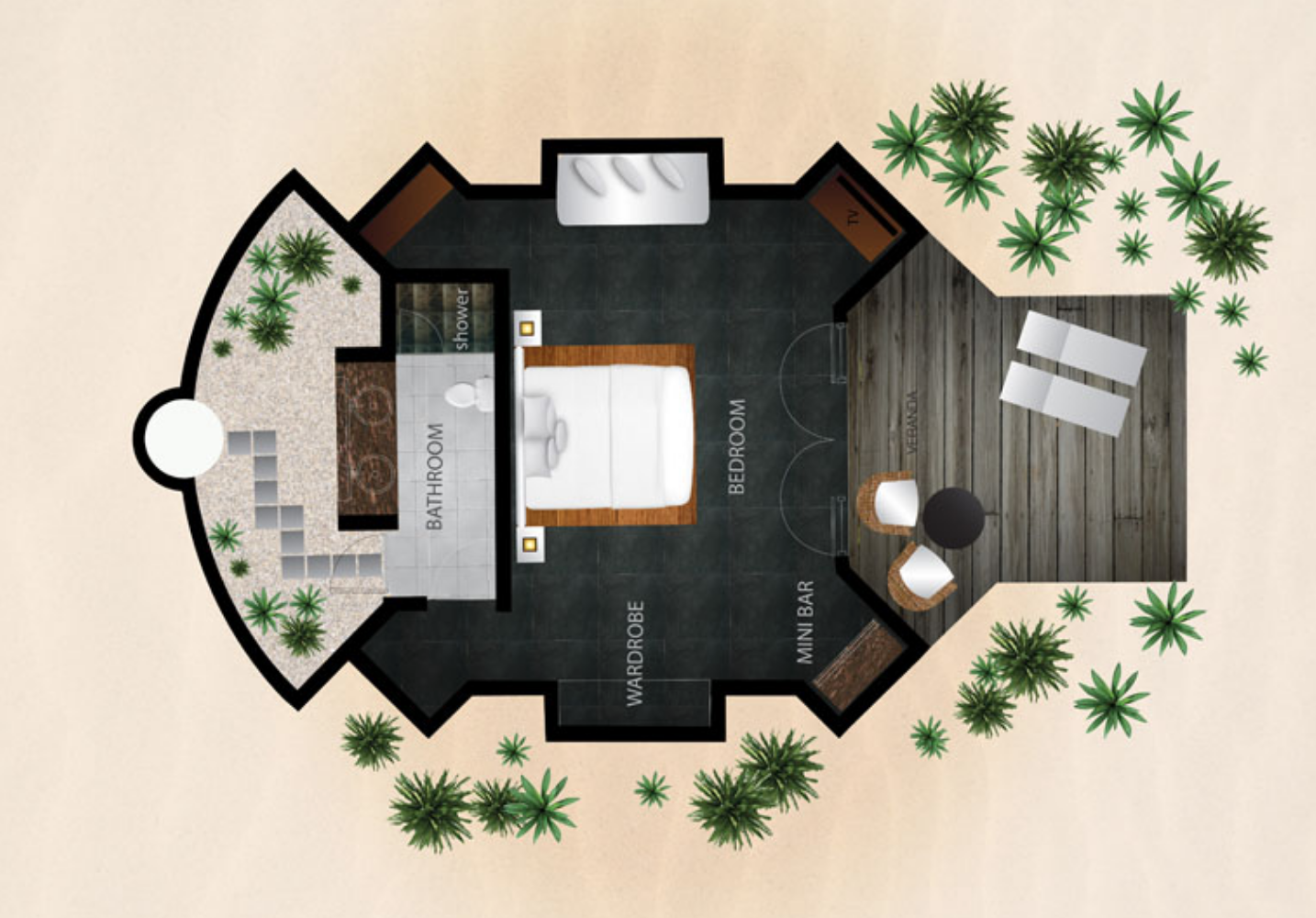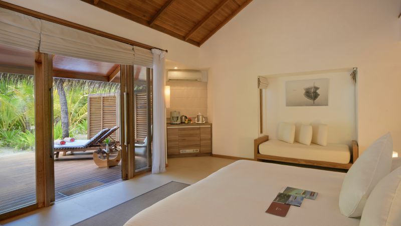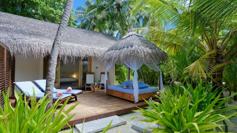 别墅坐落在海滩上,被丰富的植被所环绕,毗邻海滩,在面朝大海的私人甲板上设有日光躺椅。有私人阳台,房间浴室是半开放式的,并设有双面盆和淋浴一个室外花园区设有石头做的花洒淋浴。