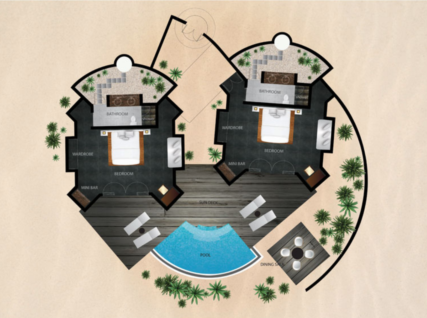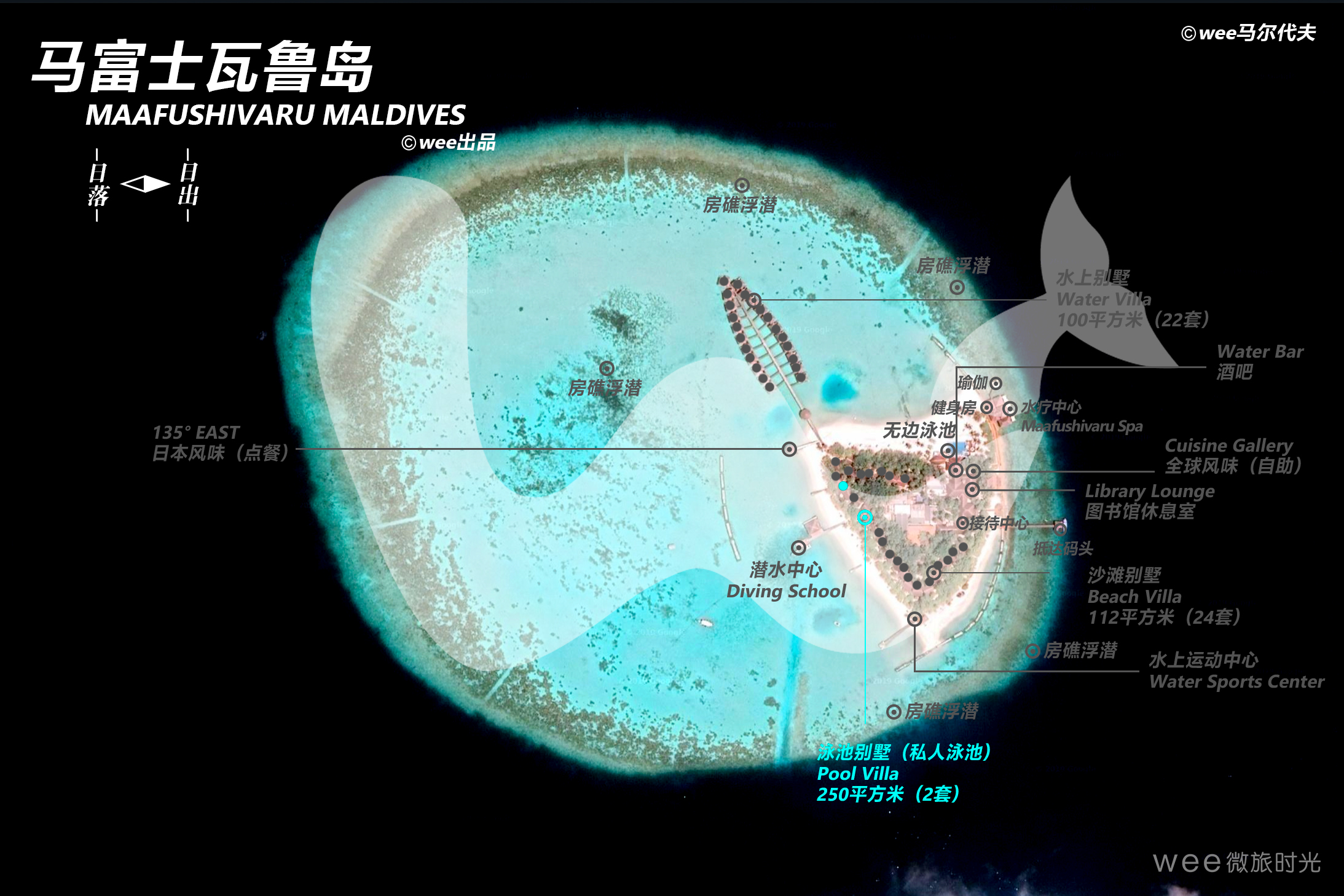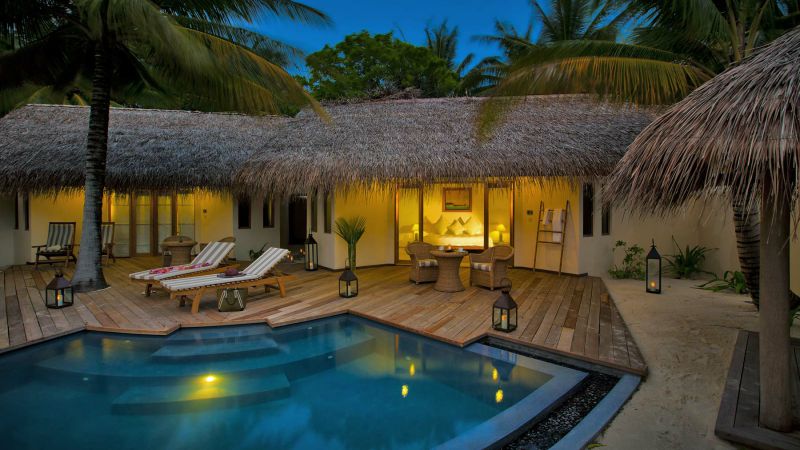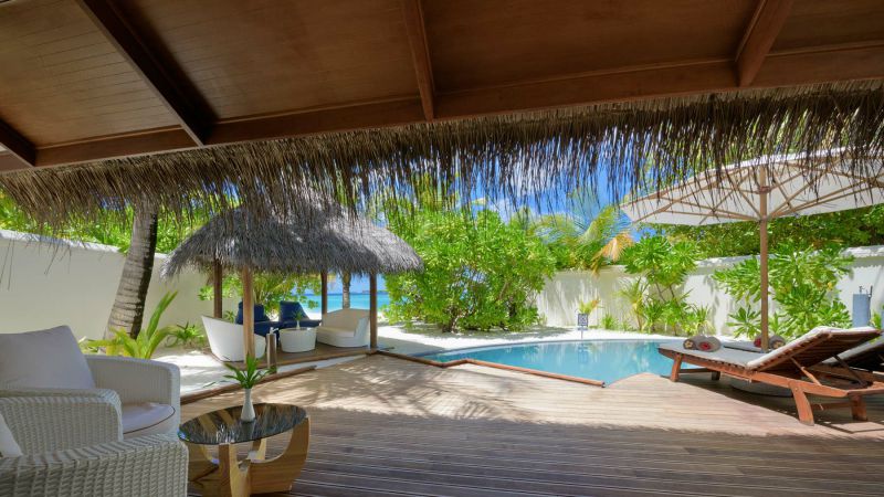 泳池别墅散落在高跷蓝色泻湖上,从私人木制甲板可以直接进入海水中,两个海滩别墅之间共享一个私人游泳池,但每个泳池别墅都有一个共同的入口走廊和一个单独的餐厅馆。