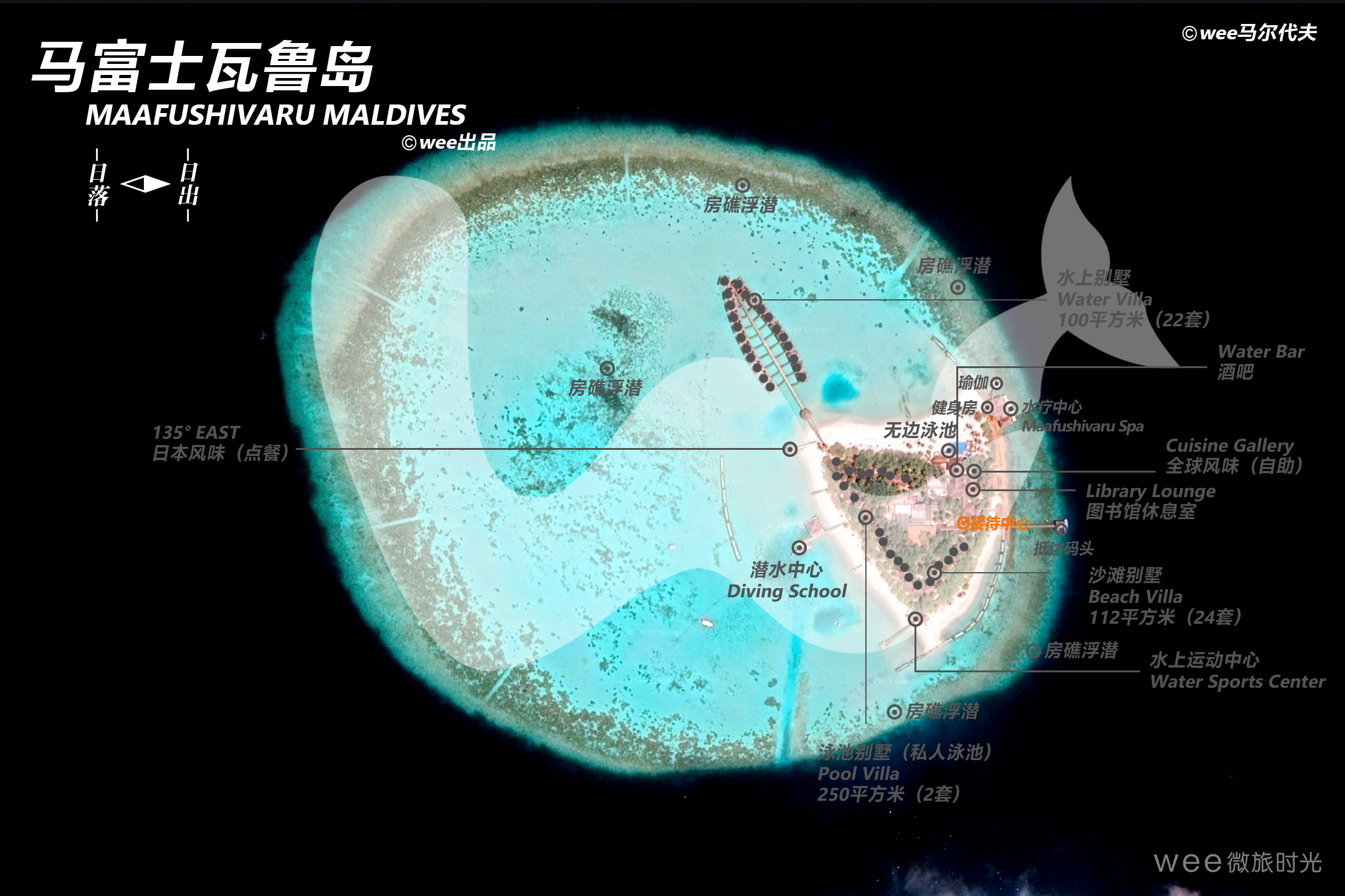 马富士瓦鲁岛(Maafushivaru Maldives)2013年开业,属于UNIVERSAL酒店品牌,环岛周长700米,在马尔代夫属于小型度假岛屿。沙滩5分/最高5分,100%环岛,平均宽度20米;浮浅5分/最高5分,房礁100%环岛,距离沙滩最近20米。