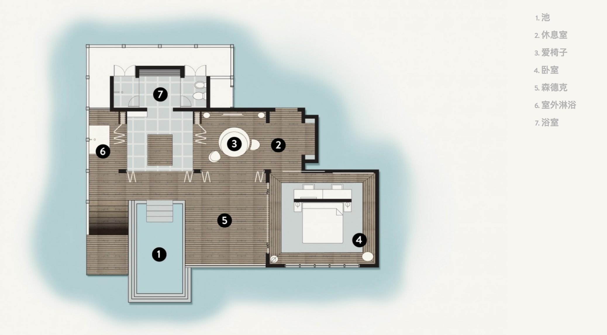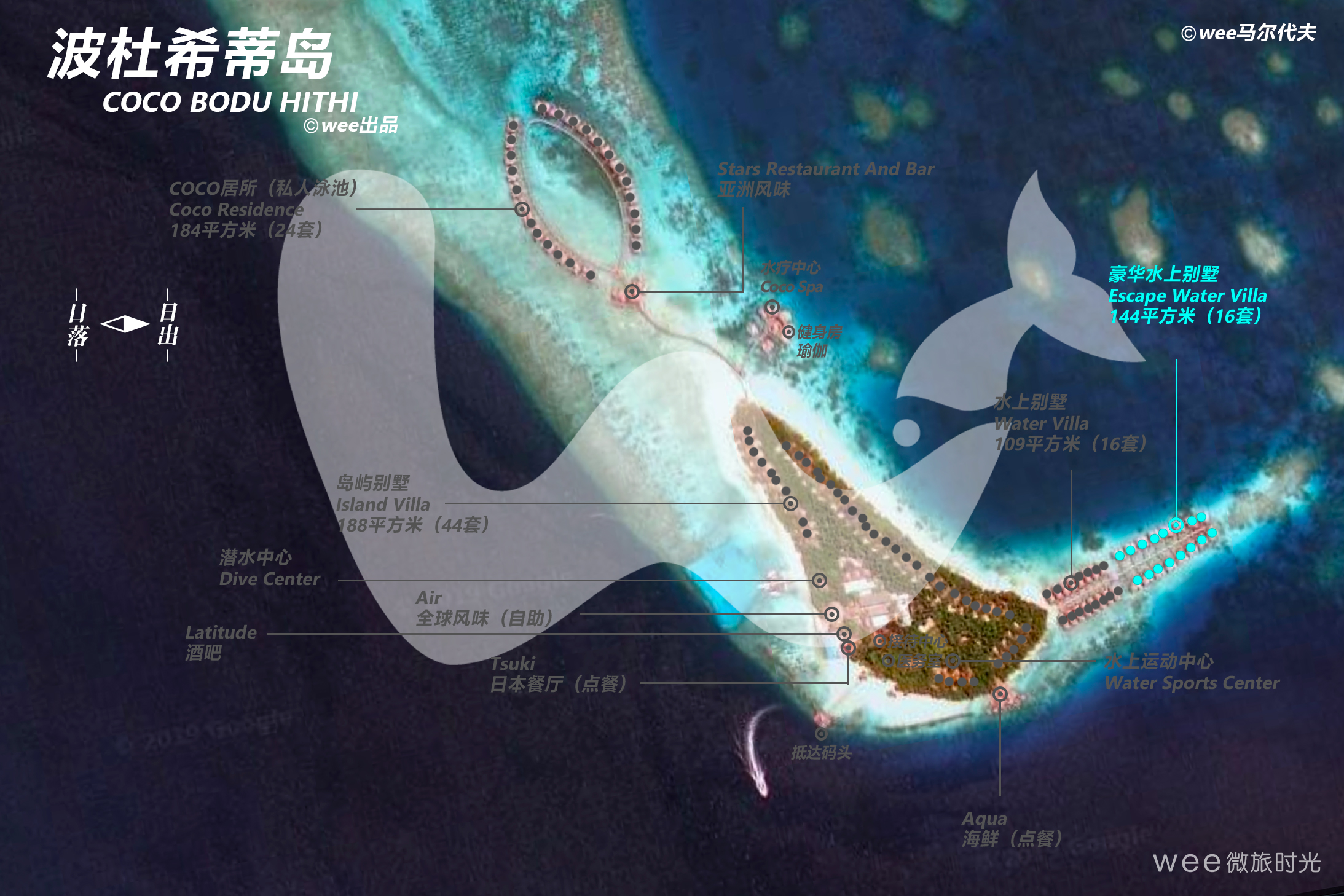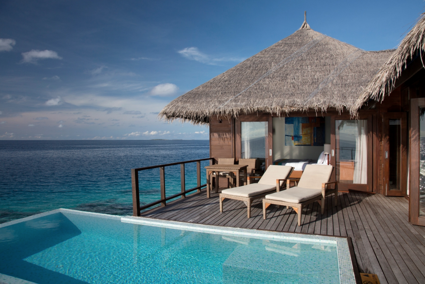 顶级别墅拥有特大的床组,和宽敞卫浴间和加大面盆与独特设计的浴缸,从这里直接可看到海洋景致。一个宽敞室外甲板设置,加上一个小泳池,无论是做日光浴、用餐、休息、欣赏美丽的海景都是绝佳的享受。