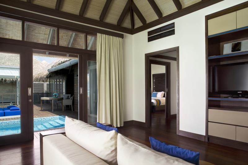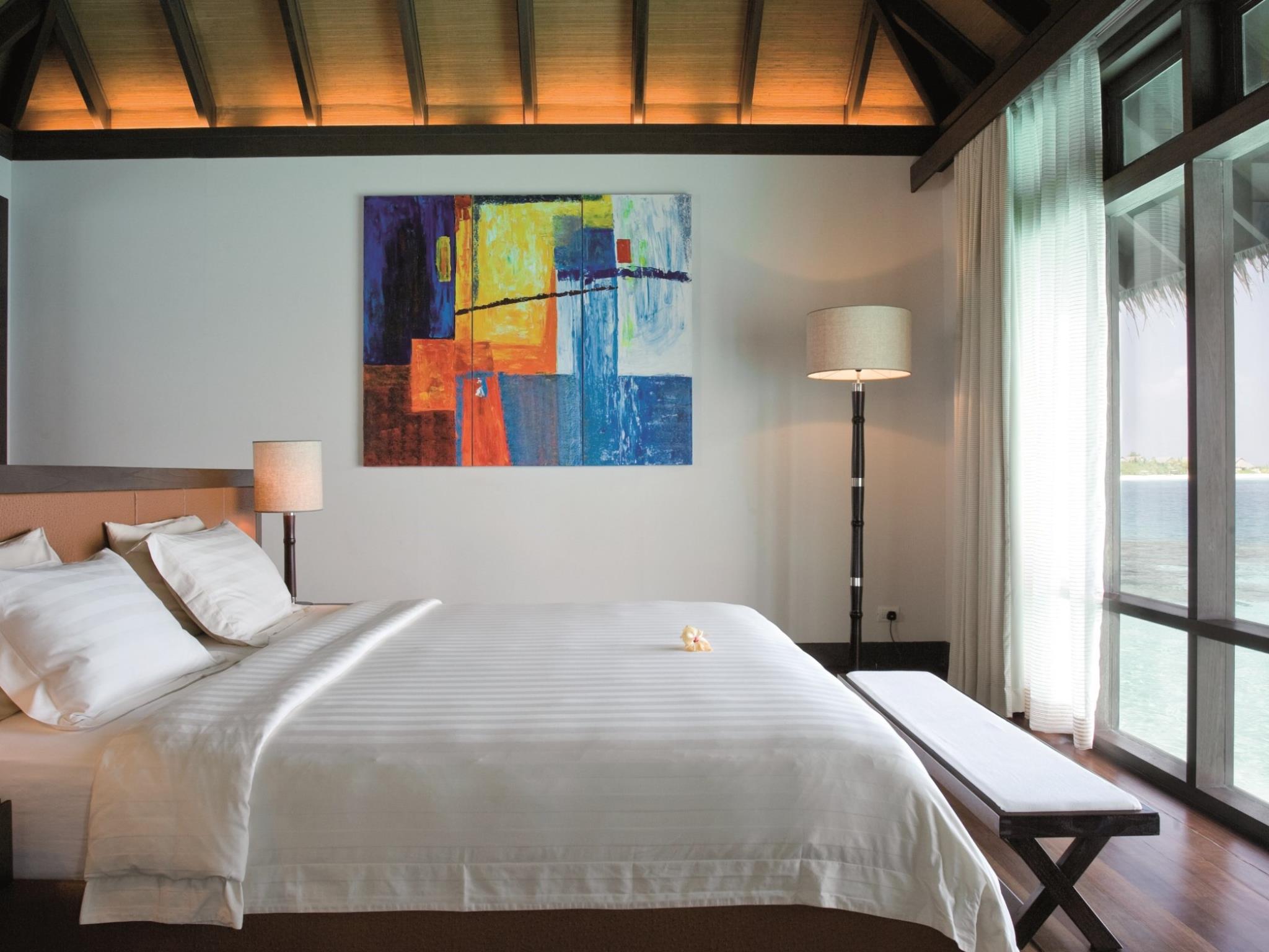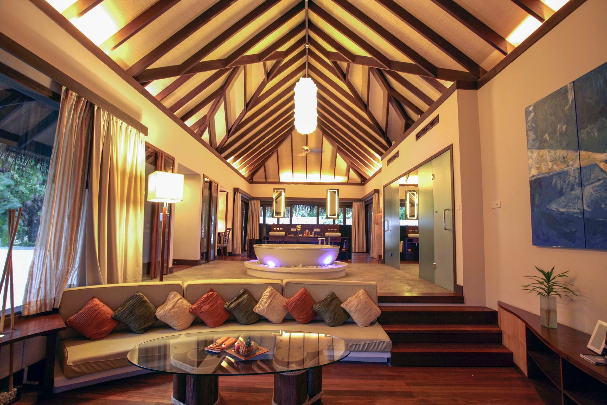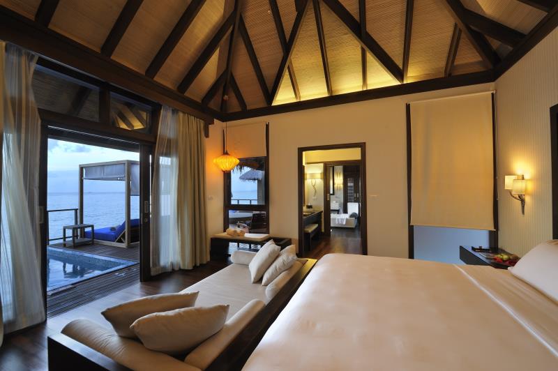 水上别墅内提供特大号的软床,宽敞的浴室内设有豪华双洗手盆,和超大的浴缸。充满阳光的私人阳台连接着的是一个私人泳池,还有一个露天浴室可供使用。在这里游泳的时候,放眼望去那赏心悦目的无敌海景。
