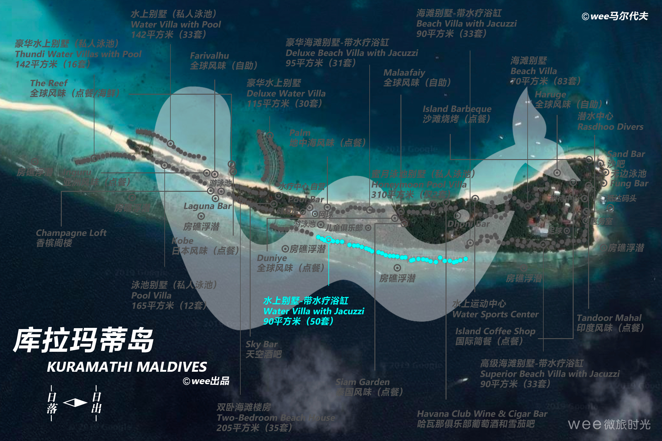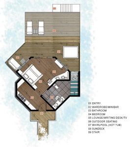 这些宏伟的别墅也建在基柱上,临近的珊瑚礁拥有丰富多彩的海洋生物群。别墅设有带特大号床的卧室以及带双梳妆台和花洒淋浴的宽敞浴室。