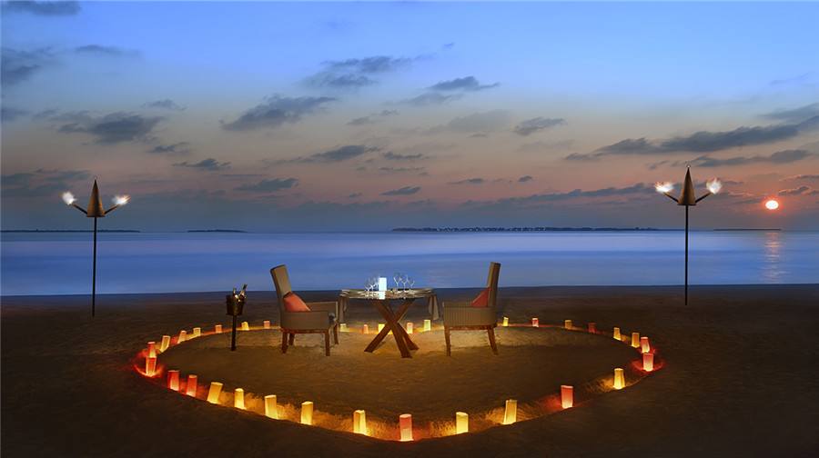 日落时在沙滩上举行“重温誓言”仪式,接受传统的马尔代夫配饰并受到酋长的祝福