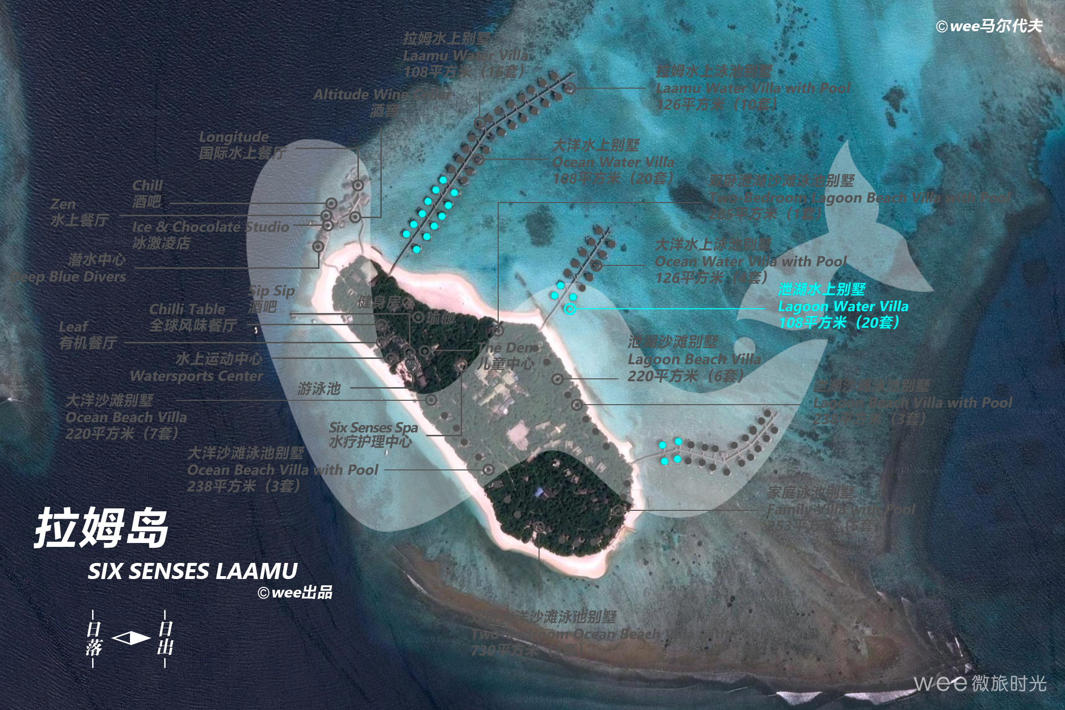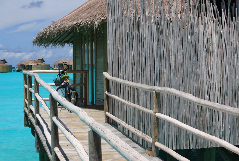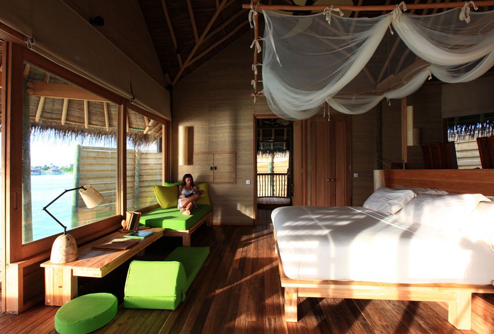 通过木质码头前往这些在竹质围墙中的水上天堂,这里拥有沙发床、水上吊床和透明餐桌等设施,脚下就是波光粼粼的海面。每幢别墅中都配备高脚床以方便观赏壮丽的海天景观。别墅还拥有玻璃浴缸和搭配淋浴设施的私人水上平台,在大洋的拥抱中沐浴——这是极其难得的体验。同样的,别墅配有悬空观景平台。