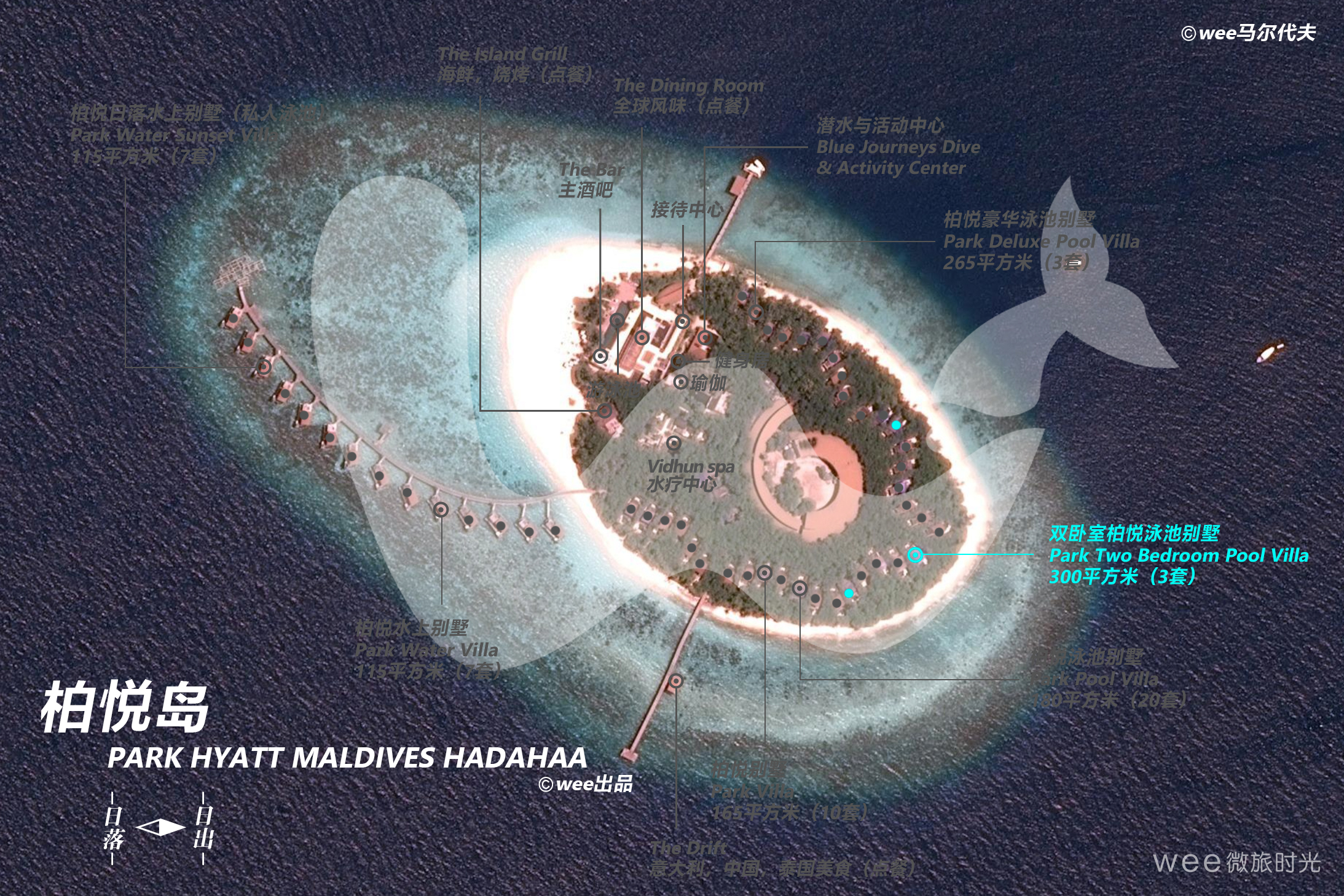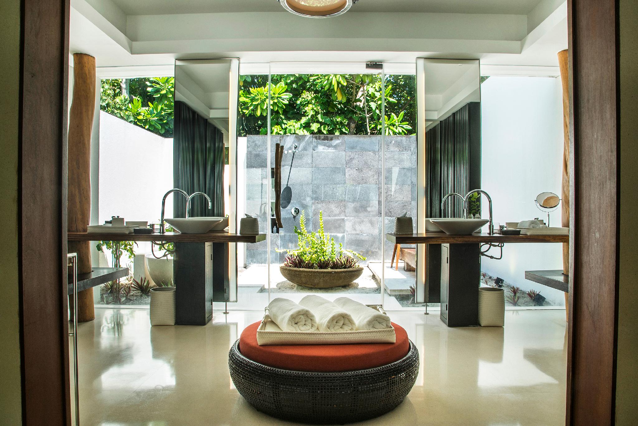 面积为 300 平方米的双卧室泳池别墅内有一张特大床、私人室外水磨石浴缸和淋浴区。还配有两张单人床的 44 平方米第二间卧室和独立浴室。房间外设有带半入水日光浴床的大型泳池、户外露台/凉亭。