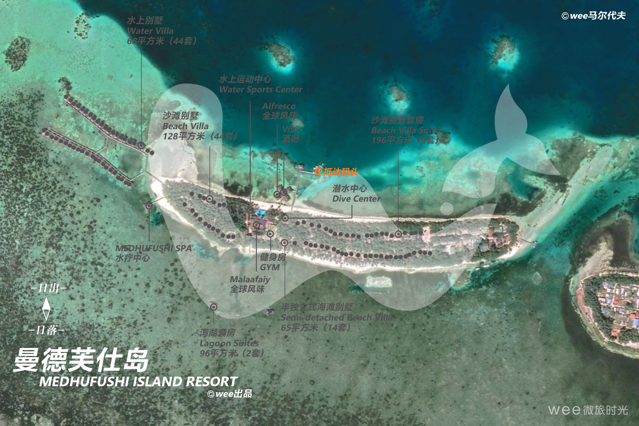 曼德芙仕岛(Medhufushi Island Resort)环岛周长1960米,在马尔代夫属于中型度假岛屿。沙滩5分/最高5分(沙滩100%环岛,平均宽度10米);浮浅3分/最高5分(房礁0%环岛)。距离马累130km,需要搭乘40分钟的水上飞机抵达曼德芙仕岛。