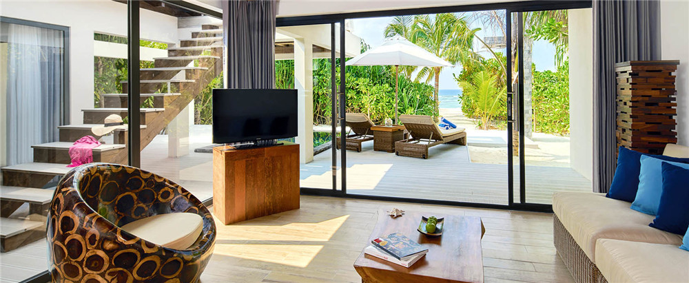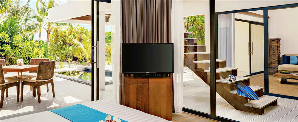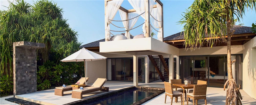 环绕海滩泳池套房的热带花园是客人们放松身心、休养生息的宁静天堂。户外设有日光躺椅、私人泳池以及高台上配备懒人沙发的凉亭,这里是欣赏印度洋美景的完美之所。房内设有一间大卧室,配备特大床及记忆海绵床垫。起居室里的大沙发床可用作床铺以容纳更多客人。