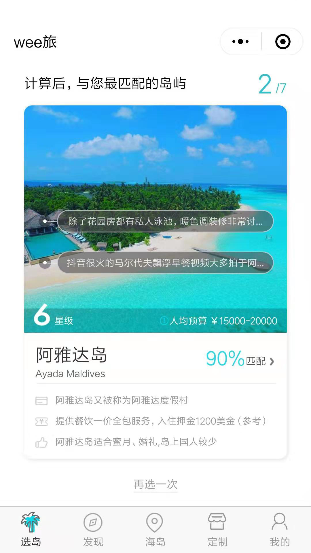 点击“选好了”,系统会给出参考岛屿,可点击卡片进入岛屿详情页查看岛屿信息攻略等,如果对结果不满意还可点击“再选一次”更改条件项后重新选岛。