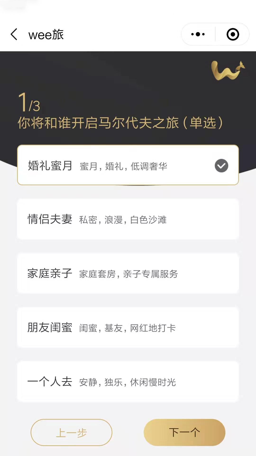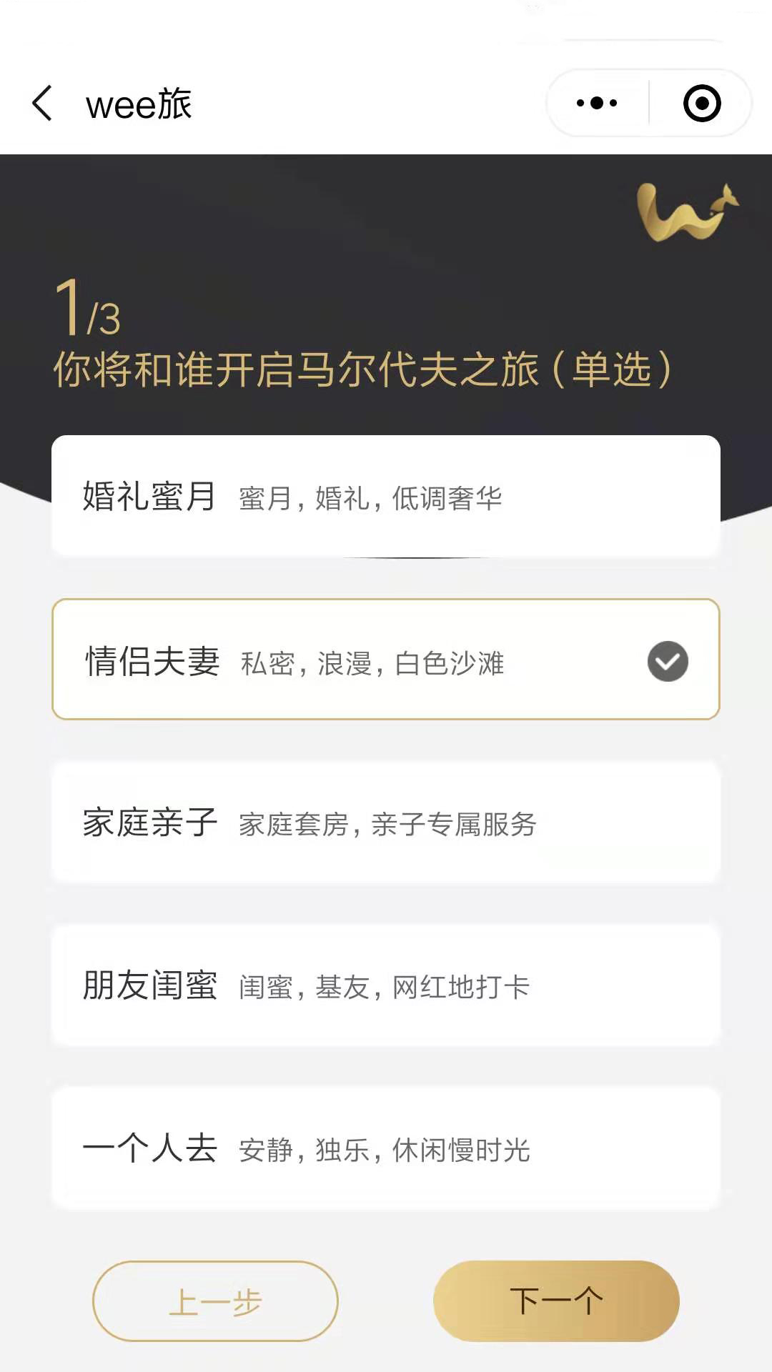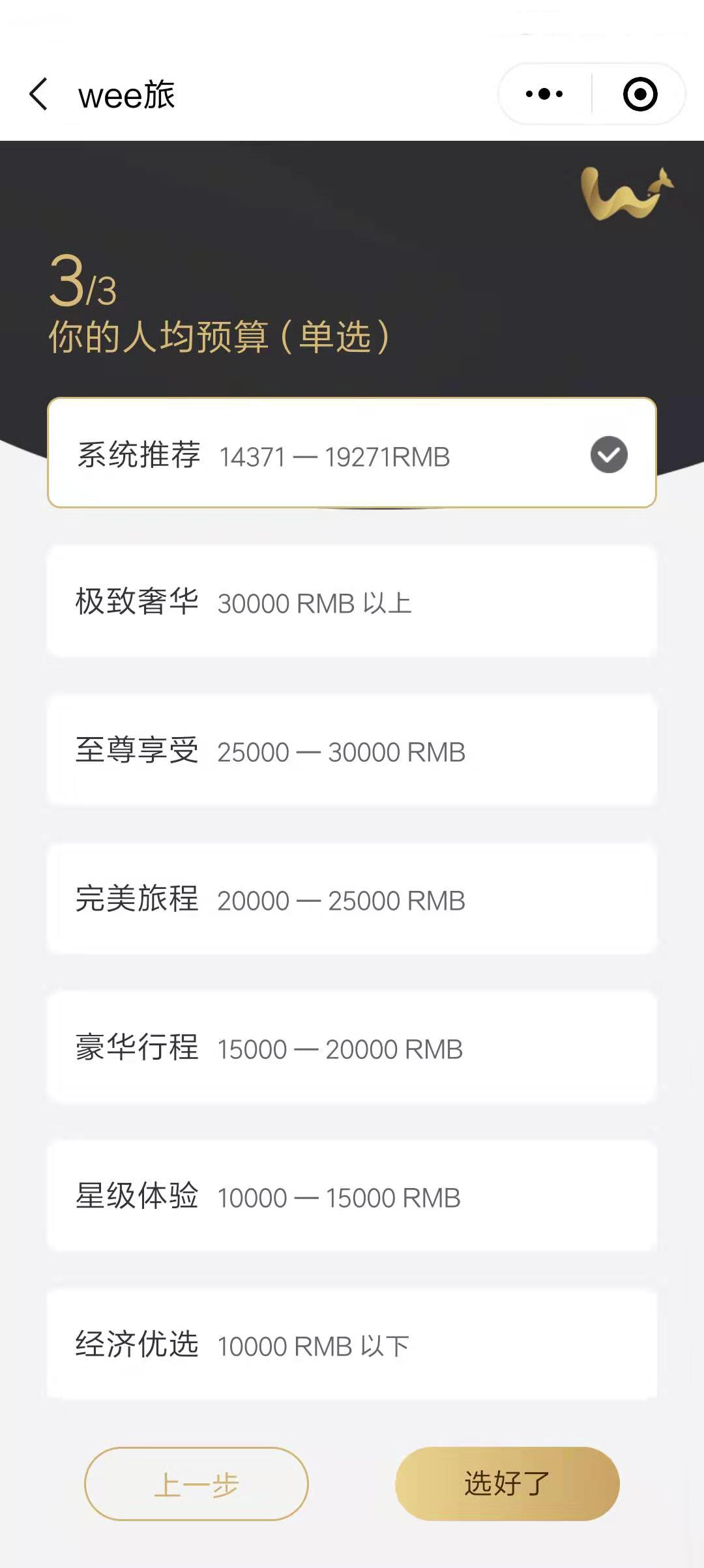 在上面的选项中选定自己心仪的选项后,需要选择自己的心理预期价位,如果对价位要求比较模糊的童鞋可以选择系统推荐项,这是wee旅结合大数据给出的参考综合消费水平,可提供一定的参考价值。