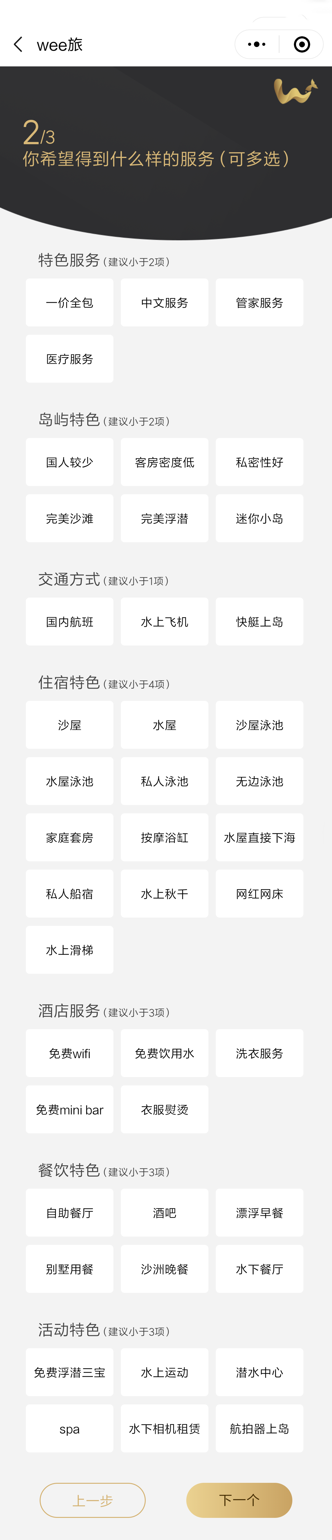点击下一步,进入需求项选择界面,选岛工具将关键的岛屿特点和人群需求做了较为详细的分类,在这里简单讲解一下:
