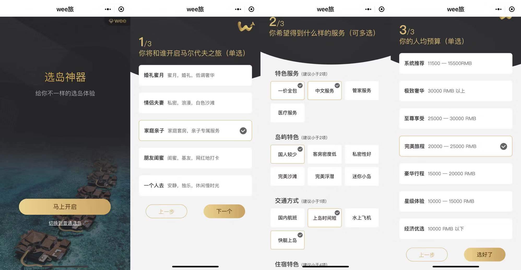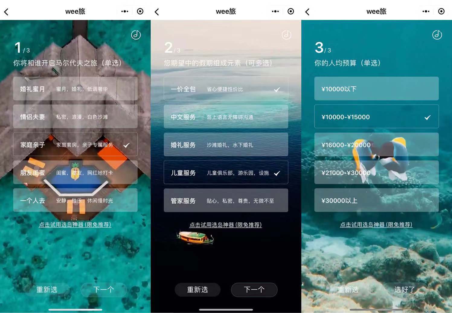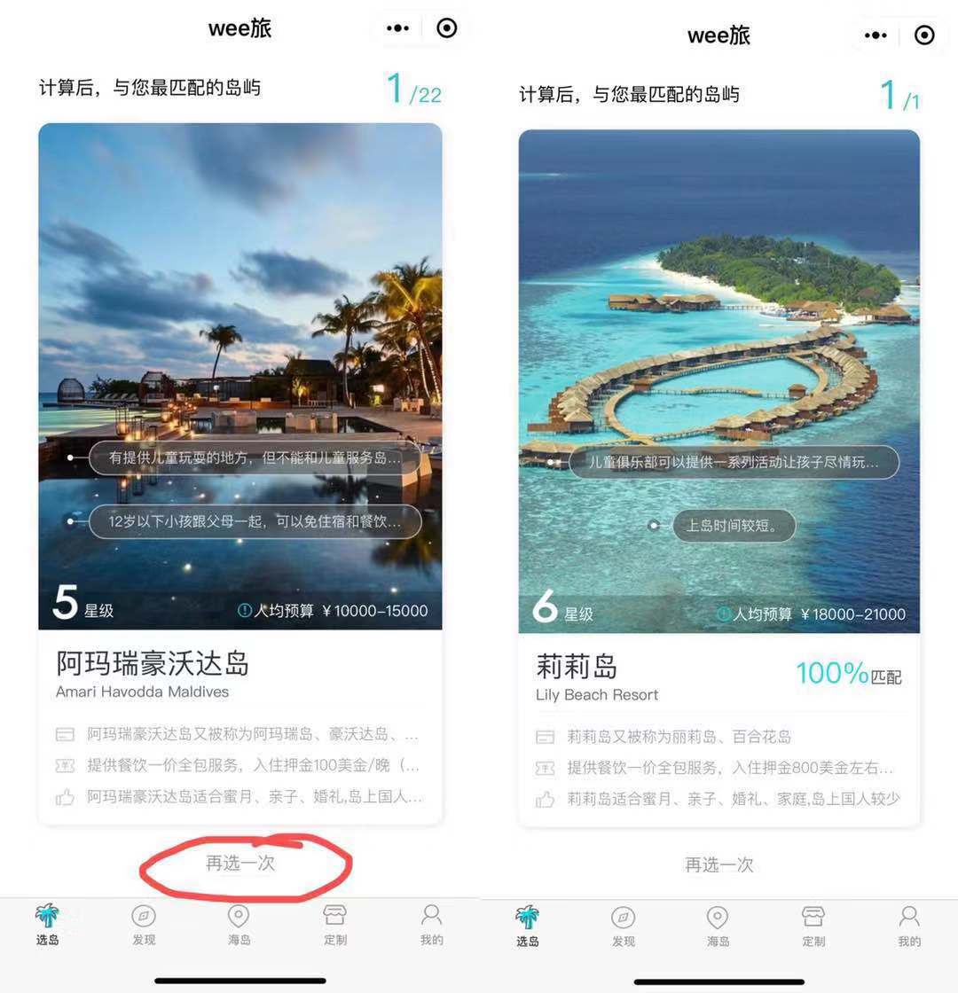PS:对于明确了某个时间,要开始做马代亲子出行计划的朋友,可能上述的初选结果,对于你来说,依然解决不了你的选岛困难症!so,“选到神器”问世了!核心数据,精准推算,快速的定位到与你最匹配的岛屿,同时还能给你意外的需求选择,比你还懂你~