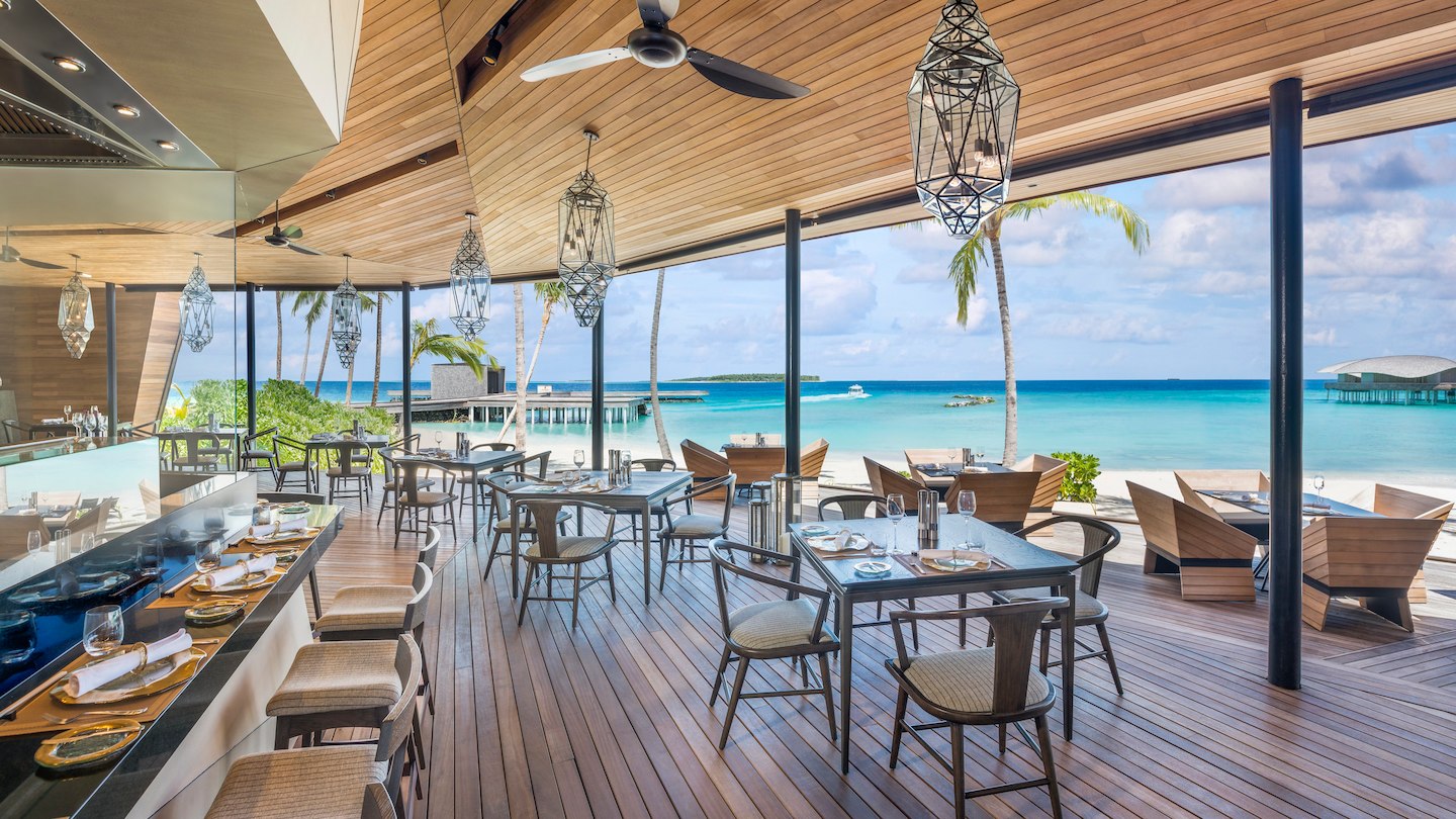精美的用餐空间使用白橡木和时尚的灰色装饰,配有现代黑色铁吊灯和浪漫的隐藏式照明。经验丰富的厨师努力实践他们的烹饪技术。同时,客人可以通过半封闭的用餐室和露天露台欣赏热带树林和白色沙滩所构成的无拘无束的景致。