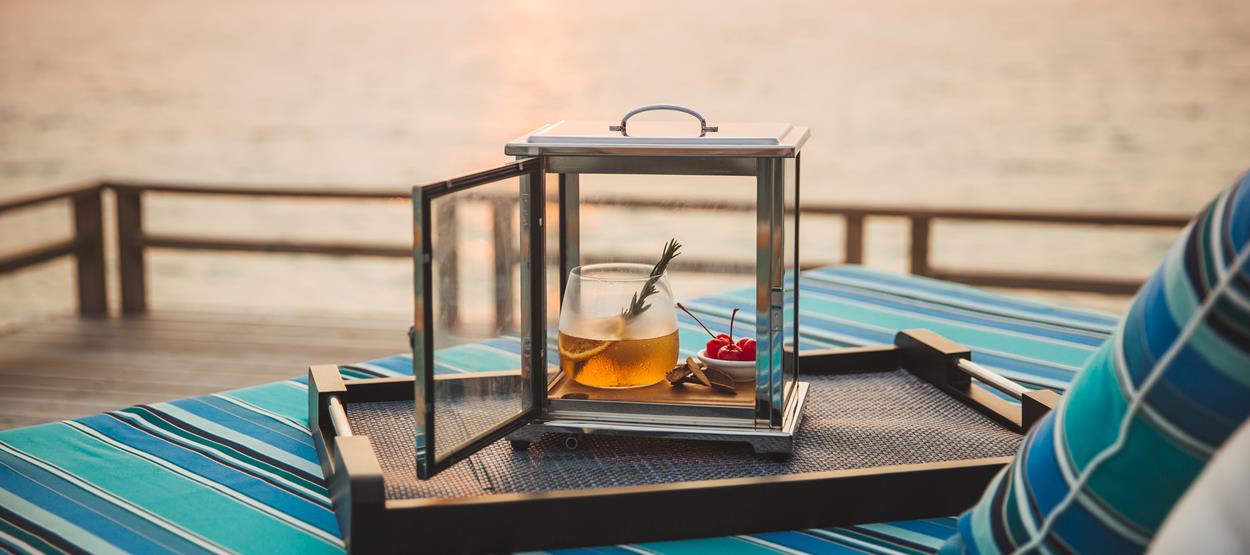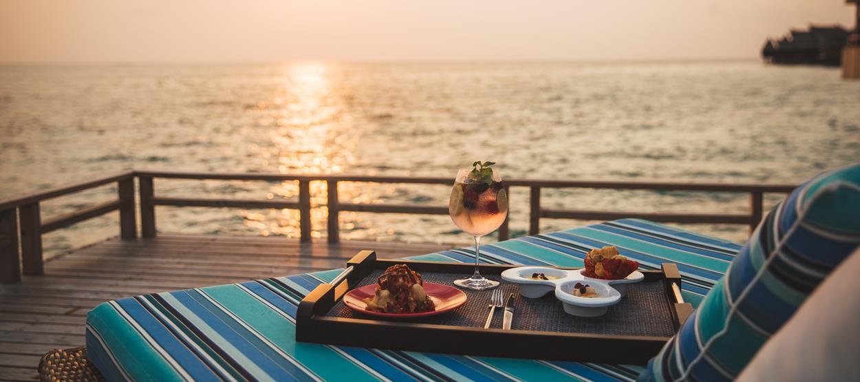 Cyan的服务团队呈上美味佳肴和精品香槟,精致正餐配有特有的环境,在私家水上露台的浴床上畅享午后阳光,感受度假无线的惬意。