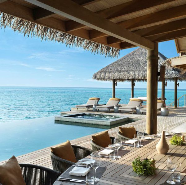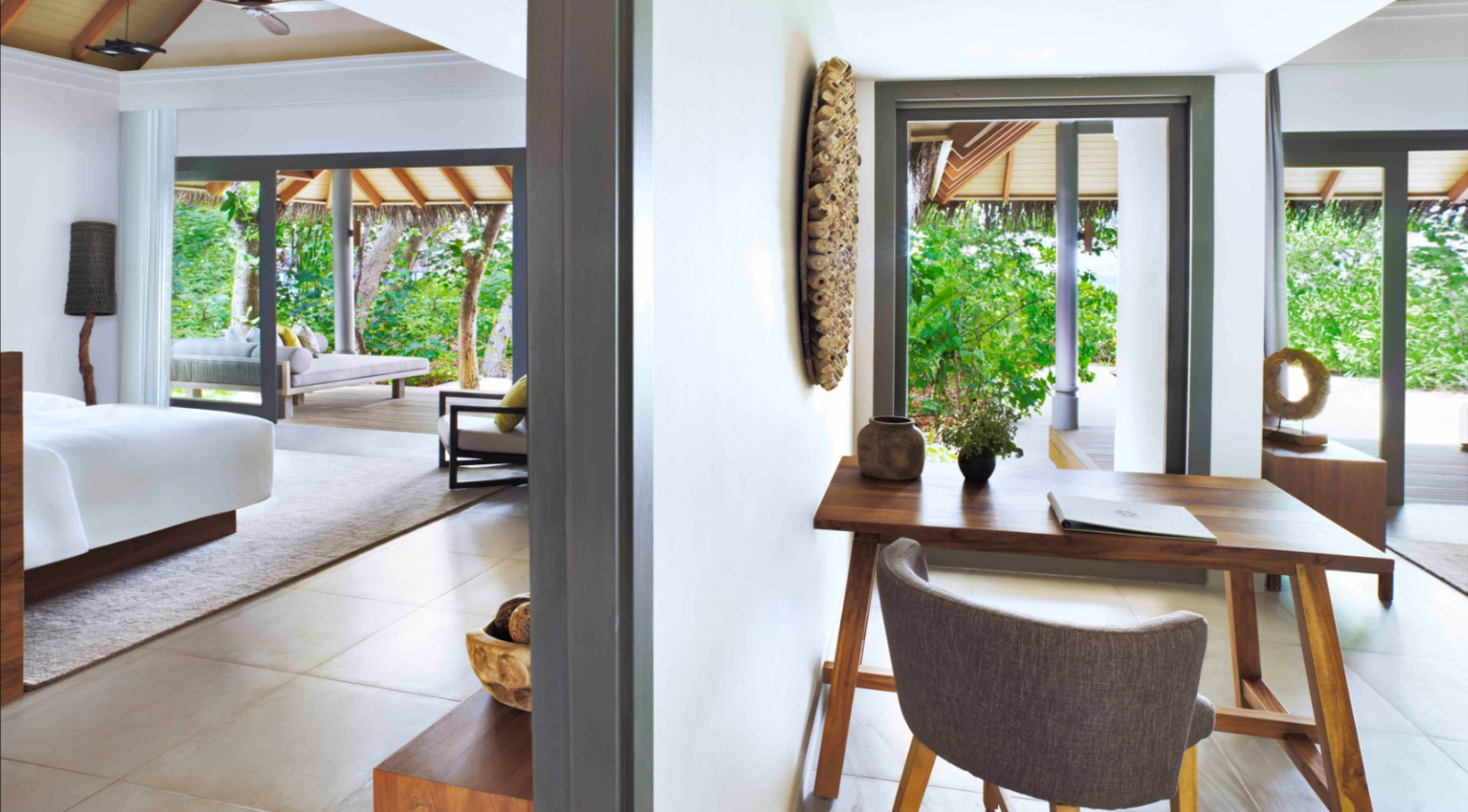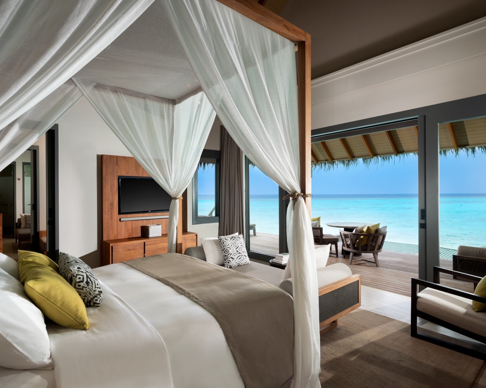 Beach Pool Suite 沙滩泳池套房更是度假村中更宁静的一个空间,设有独立的起居室和32平方米的私人游泳池,卧室、起居室和浴室均面向泻湖湛蓝的海水。