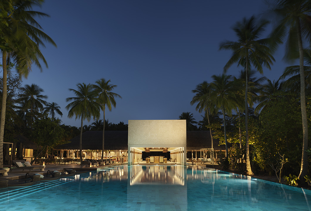 户外池畔休息室的设计经典舒适,旨在为客户营造一个舒心放松的环境。偌大的无边泳池,晚上灯光倒映在水里,非常漂亮!